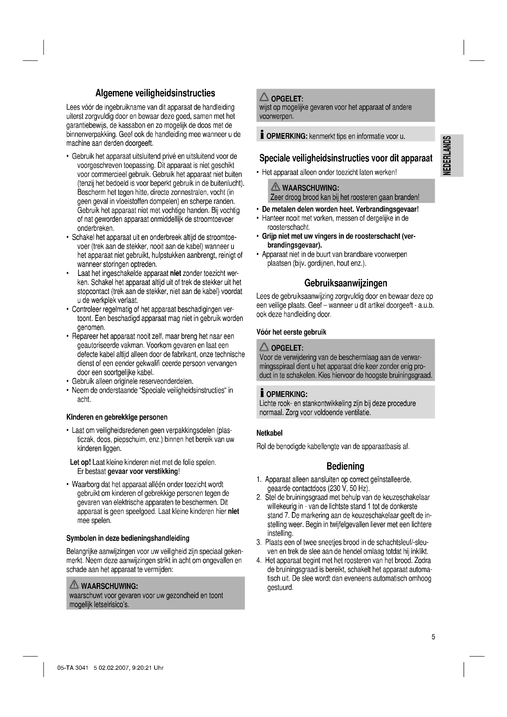 - Trek de kruimellade aan de handgreep naar buiten, verwij- der de broodresten en schuif de lade weer terug. Technische gegevens Model:............................................................................... TA 3041 Spanningstoevoer: .............................................220-240 V, 50 Hz Opgenomen vermogen:......................................................800 W Beschermingsklasse:................................................................... Ι Dit apparaat is gekeurd conform de op dit moment van toepas- sing zijnde CE-richtlijnen zoals bijvoorbeeld elektromagnetische compatibiliteit en laagspanningsvoorschriften en is geconst- rueerd volgens de nieuwste veiligheidstechnische voorschriften. Technische wijzigingen voorbehouden! Garantie Voor het door ons geleverde apparaat verlenen wij een garantie van 24 maanden vanaf koopdatum (kassabon). Eventuele gebreken aan het apparaat of aan het toebehoren die zijn ontstaan door productie- of materiaalfouten verhelpen wij binnen deze periode kosteloos door middel van reparatie of, naar ons oordeel, door vervanging. Eventuele garantiegevallen verlengen noch de geldigheidsduur van de garantie, noch begint daardoor een nieuwe garantieperiode! Het koopbewijs geldt als garantiebewijs. Zonder dit bewijs kan geen kosteloze reparatie of vervanging plaatsvinden. Geef in garantiegevallen het complete apparaat in de originele verpakking samen met de kassabon af bij uw handelaar. Niet defecten aan de hulpstukken of aan de slijtende onder- delen, maar ook reiniging, onderhoud of de vervanging van slijtende delen vallen niet onder de garantie en geschieden altijd tegen berekening! Bij ingrepen door derden komt de garantieverlening te vervallen. Na de garantieperiode Na afl oop van de garantieperiode kunnen reparaties tegen bere- kening worden uitgevoerd door de betreffende vakhandelaar of de technische dienst. 05-TA 3041 6 02.02.2007, 9:20:24 UhrNEDERLANDS