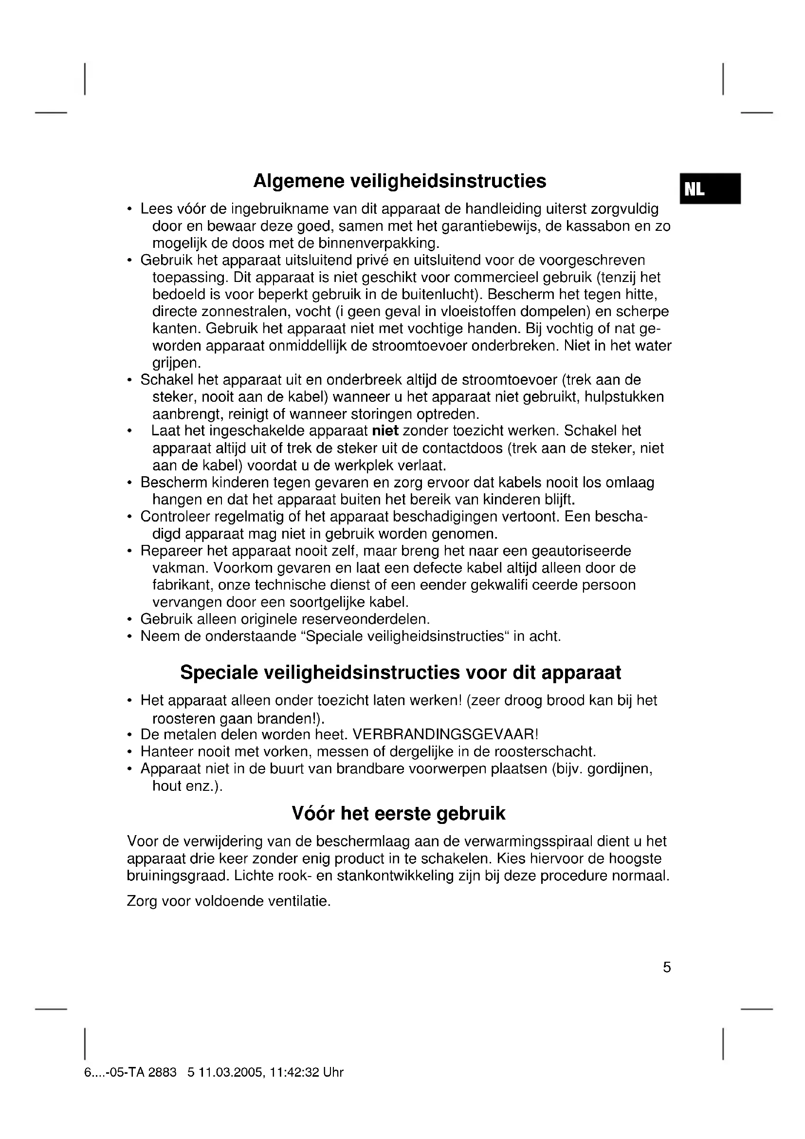 - Apparaat niet in de buurt van brandbare voorwerpen plaatsen (bijv. gordijnen, hout enz.). Vóór het eerste gebruik Voor de verwijdering van de beschermlaag aan de verwarmingsspiraal dient u het apparaat drie keer zonder enig product in te schakelen. Kies hiervoor de hoogste bruiningsgraad. Lichte rook- en stankontwikkeling zijn bij deze procedure normaal. Zorg voor voldoende ventilatie. 6....-05-TA 2883 5 11.03.2005, 11:42:32 UhrNL