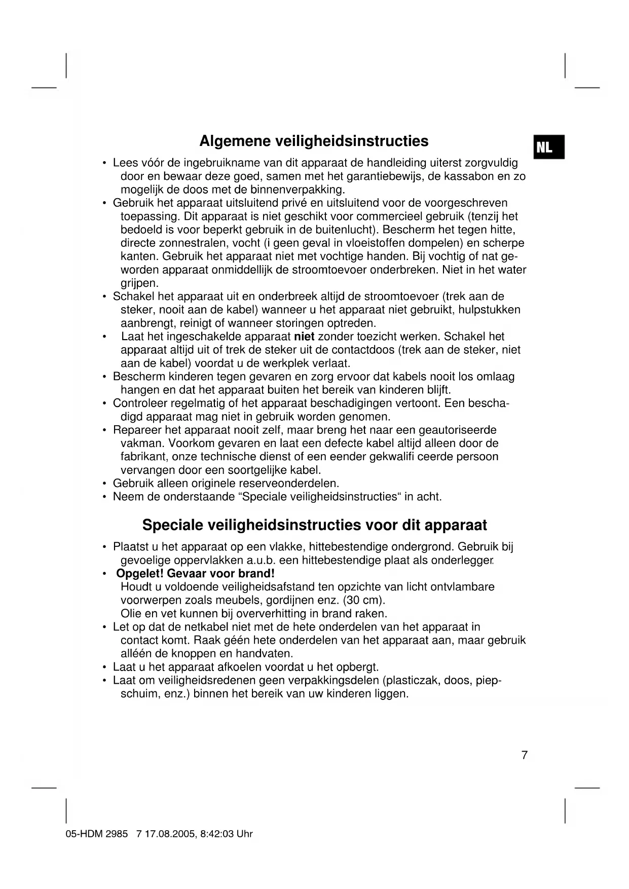 - Laat om veiligheidsredenen geen verpakkingsdelen (plasticzak, doos, piep- schuim, enz.) binnen het bereik van uw kinderen liggen. 05-HDM 2985 7 17.08.2005, 8:42:03 UhrNL