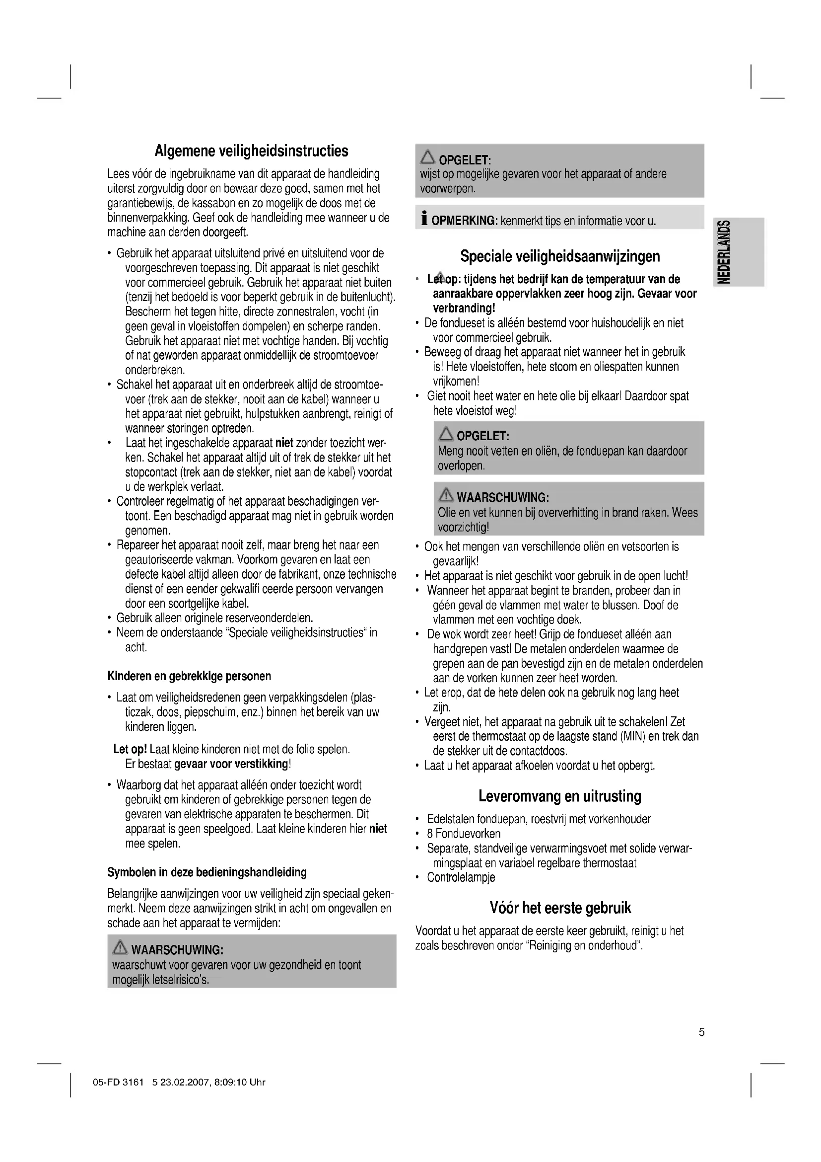 - Controlelampje Vóór het eerste gebruik Voordat u het apparaat de eerste keer gebruikt, reinigt u het zoals beschreven onder “Reiniging en onderhoud”. 05-FD 3161 5 23.02.2007, 8:09:10 Uhr6 NEDERLANDS NEDERLANDS OPGELET: Voor het verwijderen van de beschermlaag op de verwar- mingssokkel dient u het apparaat ca. 10 minuten zonder fon- duepan op MAX-vermogen in te schakelen. Laat het apparaat niet zonder toezicht wanneer het in gebruik is. OPMERKING: Daarbij is een lichte rookontwikkeling normaal. Zorgt u wel voor voldoende ventilatie. Gebruiksaanwijzingen