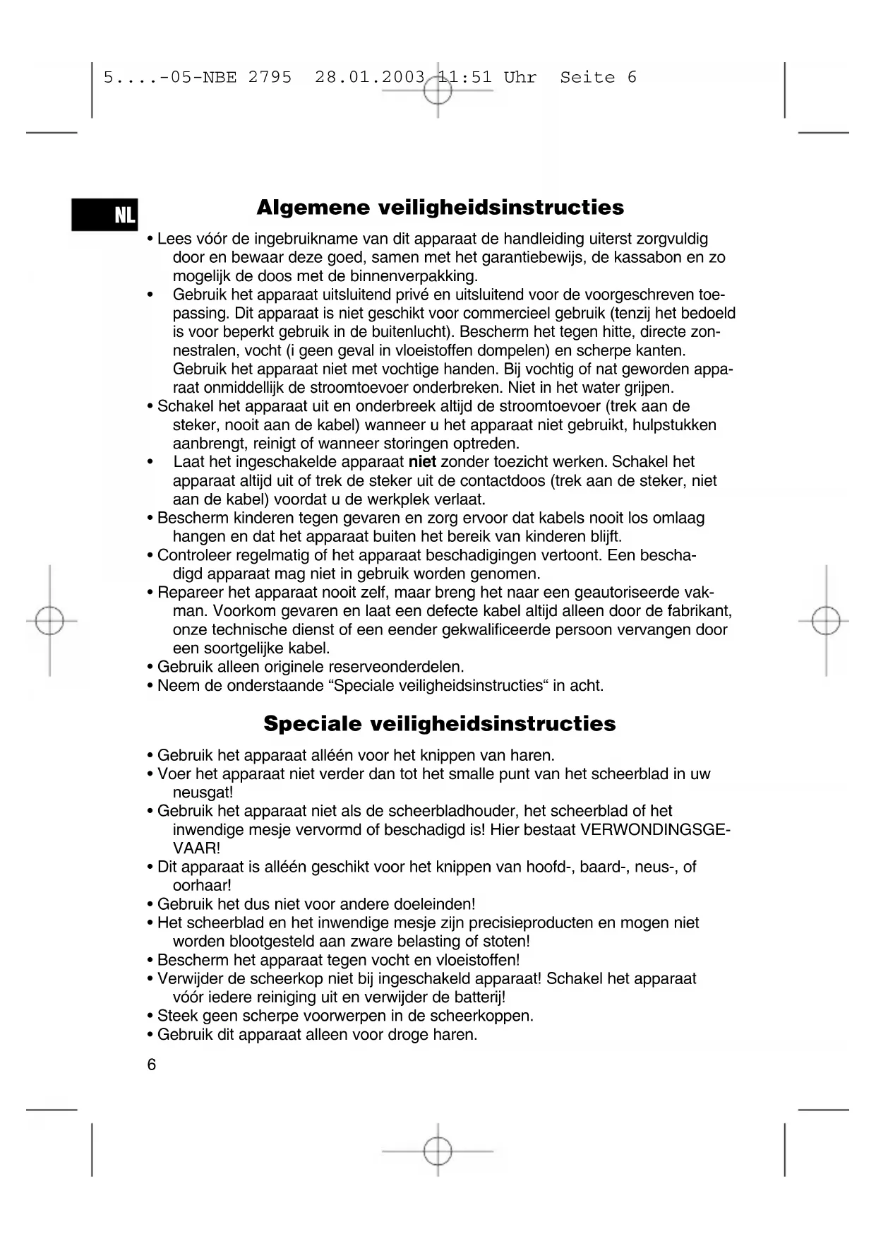 5....-05-NBE 2795 28.01.2003 11:51 Uhr Seite 6Accessoires Edelstalen scheerkop (neushaarknipper) Kam Precisiescheerkop (tondeuse) Reinigingsborstel Combistandaard Speciale olie Batterijen plaatsen (niet bij de levering inbegrepen)
