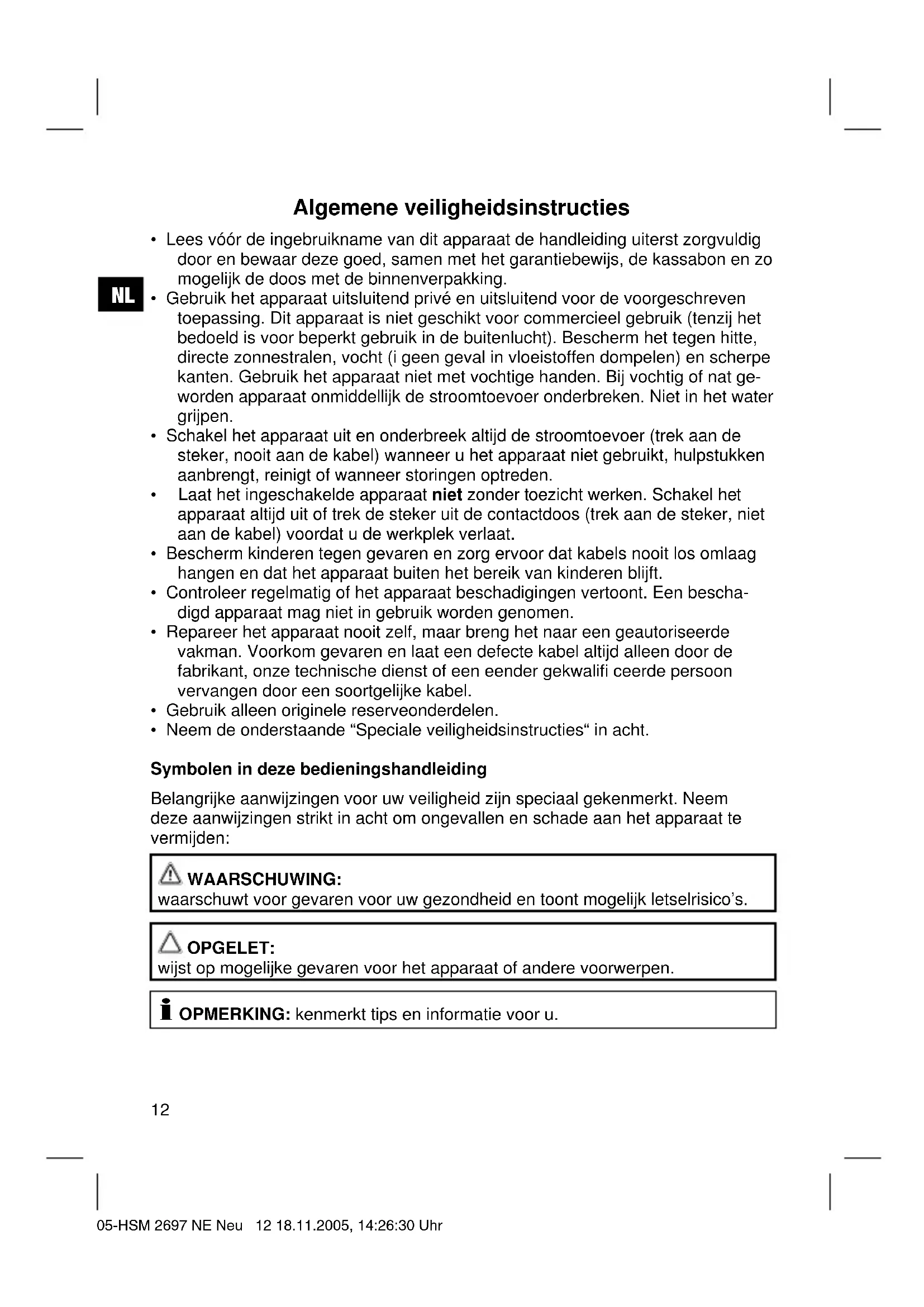 - Neem de onderstaande “Speciale veiligheidsinstructies“ in acht. Symbolen in deze bedieningshandleiding Belangrijke aanwijzingen voor uw veiligheid zijn speciaal gekenmerkt. Neem deze aanwijzingen strikt in acht om ongevallen en schade aan het apparaat te vermijden: WAARSCHUWING: waarschuwt voor gevaren voor uw gezondheid en toont mogelijk letselrisico’s. OPGELET: wijst op mogelijke gevaren voor het apparaat of andere voorwerpen. OPMERKING: kenmerkt tips en informatie voor u. 05-HSM 2697 NE Neu 12 18.11.2005, 14:26:30 UhrNL