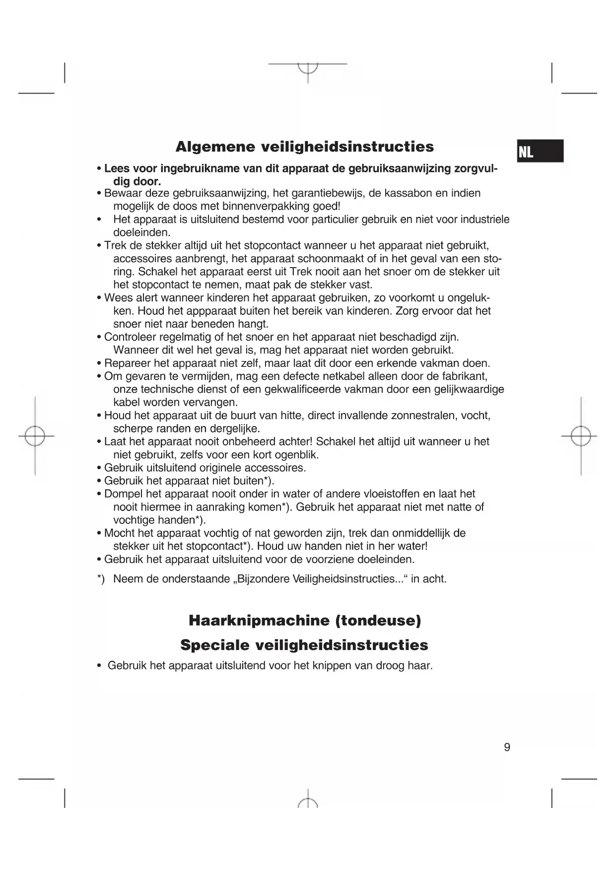 - Gebruik het apparaat uitsluitend voor de voorziene doeleinden. *) Neem de onderstaande „Bijzondere Veiligheidsinstructies...“ in acht. Haarknipmachine (tondeuse) Speciale veiligheidsinstructies