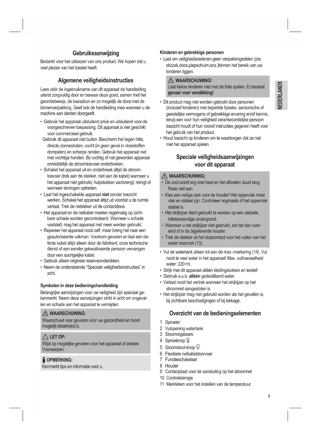 - Het strijkijzer mag niet gebruikt worden als het gevallen is, bij zichtbare beschadigingen of bij lekkage. Overzicht van de bedieningselementen 1 Sproeier 2 Vulopening watertank 3 Stoomregelaars 4 Sproeiknop 5 Stoomstoot-knop 6 Flexibele netkabeldoorvoer 7 Functieschakelaar 8 Houder 9 Contactplaat voor de aansluiting op het stroomnet 10 Controlelampje 11 Merkteken voor het instellen van de temperatuur10 12 Variabele temperatuurregelaar 13 Transparante watertank 14 MAX merkteken voor het waterniveau 15 Keramische bodemplaat Gebruiksaanwijzingen Uitpakken
