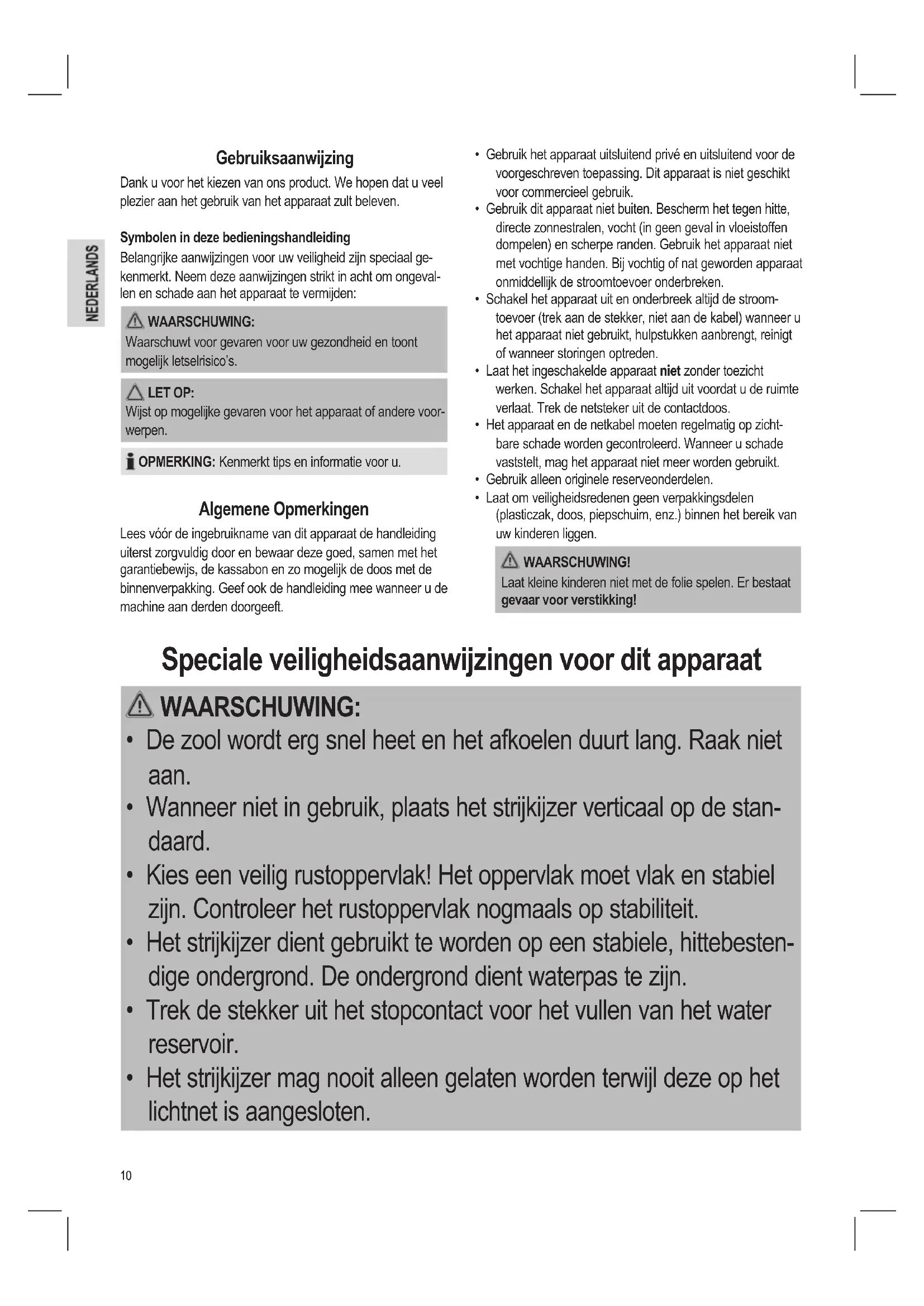 - Het strijkijzer mag nooit alleen gelaten worden terwijl deze op het lichtnet is aangesloten.11 WAARSCHUWING: