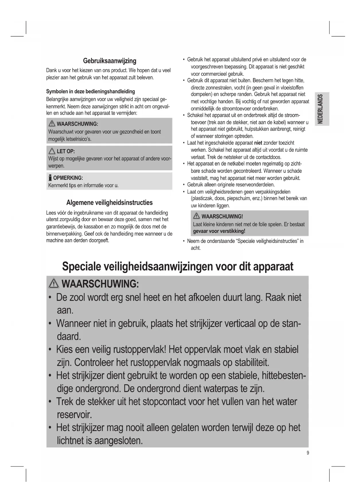 - Het strijkijzer mag nooit alleen gelaten worden terwijl deze op het lichtnet is aangesloten.10 WAARSCHUWING:
