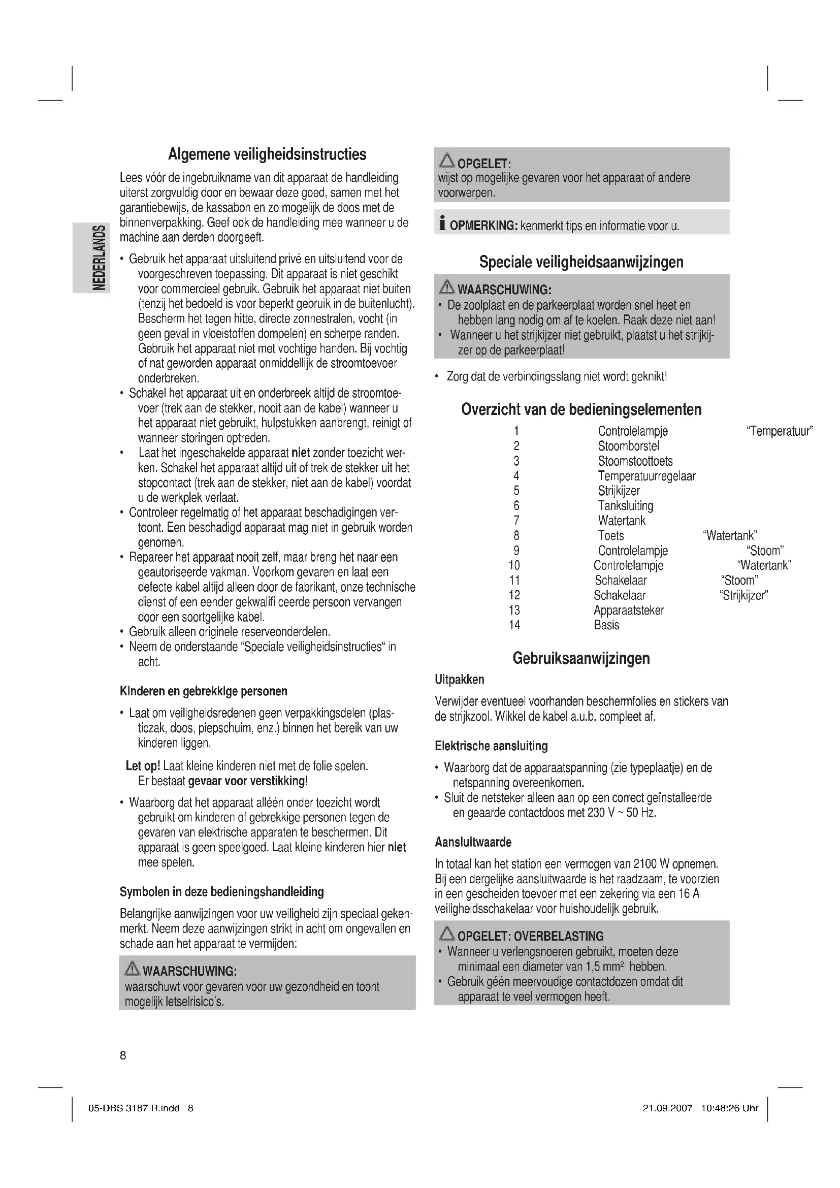 - Druk gedurende ca. 1 minuut op de stoomstoottoets totdat geen water meer lekt Het apparaat schakelt tijdens het bedrijf plotse- ling uit Is de stroomkring overbelast? Controleer de zekering in uw zekeringkast Technische gegevens Model: .........................................................................DBS 3187 R Spanningstoevoer: ....................................................230 V, 50 Hz Opgenomen vermogen: .................................................... 2100 W Beschermingsklasse: ................................................................... Ι Maximale vulhoeveelheid van de watertank: ....................1,2 Liter Nettogewicht: ........................................................................3,7 kg Dit apparaat is gekeurd conform de op dit moment van toepas- sing zijnde CE-richtlijnen zoals bijvoorbeeld elektromagnetische compatibiliteit en laagspanningsvoorschriften en is gecon- strueerd volgens de nieuwste veiligheidstechnische voorschrif- ten. Technische wijzigingen voorbehouden! 05-DBS 3187 R.indd 1005-DBS 3187 R.indd 10 21.09.2007 10:48:27 Uhr21.09.2007 10:48:27 Uhr11 NEDERLANDS NEDERLANDS Garantie Voor het door ons geleverde apparaat verlenen wij een garantie van 24 maanden vanaf koopdatum (kassabon). Eventuele gebreken aan het apparaat of aan het toebehoren die zijn ontstaan door productie- of materiaalfouten verhelpen wij binnen deze periode kosteloos door middel van reparatie of, naar ons oordeel, door vervanging. Eventuele garantiegevallen verlengen noch de geldigheidsduur van de garantie, noch begint daardoor een nieuwe garantieperiode! Het koopbewijs geldt als garantiebewijs. Zonder dit bewijs kan geen kosteloze reparatie of vervanging plaatsvinden. Geef in garantiegevallen het complete apparaat in de originele verpakking samen met de kassabon af bij uw handelaar. Niet alleen defecten aan de hulpstukken of aan de slijtende onderdelen, maar ook reiniging, onderhoud of de vervanging van slijtende delen vallen niet onder de garantie en geschieden altijd tegen berekening! Bij ingrepen door derden komt de garantieverlening te vervallen. Na de garantieperiode Na afl oop van de garantieperiode kunnen reparaties tegen bere- kening worden uitgevoerd door de betreffende vakhandelaar of de technische dienst. Betekenis van het symbool ‘vuilnisemmer’ Bescherm ons milieu, elektrische apparaten horen niet in het huisafval. Maak voor het afvoeren van elektrische apparaten gebruik van de voorgeschreven verzamelpunten en geef daar de elektrische apparaten af die u niet meer gebruikt. Daardoor helpt u de potentiële effecten te voorkomen die een verkeerde afvoer op het milieu en de menselijke gezondheid kunnen hebben. Op deze wijze levert u uw bijdrage aan het hergebruik, de recycling en andere verwerkingsvormen voor oude elektronische en elektrische apparaten. Voor informatie over verzamelpunten voor uw apparaten kunt u contact opnemen met uw gemeente of gemeenteadministratie. 05-DBS 3187 R.indd 1105-DBS 3187 R.indd 11 21.09.2007 10:48:27 Uhr21.09.2007 10:48:27 Uhr12 FRANÇAIS FRANÇAIS Conseils généraux de sécurité Lisez attentivement ce mode d’emploi avant de mettre l’appareil en marche pour la première fois. Conservez le mode d’emploi ainsi que le bon de garantie, votre ticket de caisse et si possible, le carton avec l’emballage se trouvant à l’intérieur. Si vous remettez l‘appareil à des tiers, veuillez-le remettre avec son mode d‘emploi.