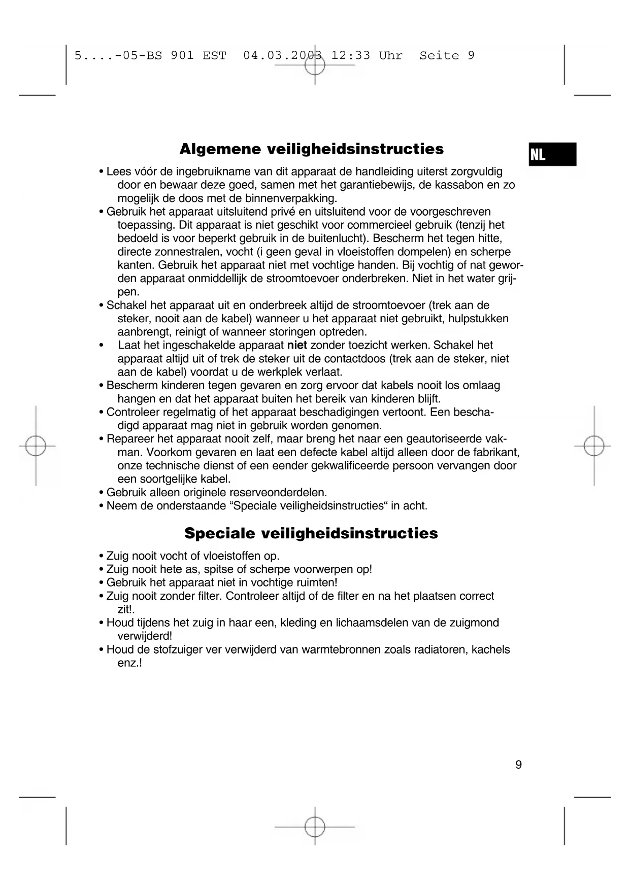 1 Kabel 2 Aan-/uitschakelaar 3 Handvat 4 Toets voor kabeloprolling 5 Indicatie vulgraad van de stofzak 6 Slangaansluiting 7 Zuigslang 8 Handgreep voor het openen van het stofvak 9 Stofvak 10 2-delige zuigbuis 11 Vloermondstuk 12 Haak aan de zuigstang, zonder afb. 13 Parkeerhulp, zonder afb. Toebehoren: „Twee-in-een“-mondstuk (voegen- en borstelmondstuk) 5....-05-BS 901 EST 04.03.2003 12:33 Uhr Seite 10Voegenmondstuk/ Borstelmondstuk: Voor het afzuigen van kussens en gordijnen en het schoonmaken van hoeken en gleuven enz. „Twee in een“-mondstuk: dichtgeklapt (zo is het mond- stuk in het opbergvak aangebracht) kunt u het gebrui- ken als voegenmondstuk. Wanneer u het wilt gebruiken als borstelmondstuk, trekt u aan het borstelgedeelte in de pijlrichting totdat het mechanisch inklikt. Vloermondstuk: voor de reiniging van tapijten of gladde oppervlakken. gladde vloeren: druk de hendel met het borstelsymbool met de voet omlaag. De borstels zijn nu zichtbaar. tapijten: druk de tegenoverliggende hendel omlaag. Verwijderen van het mondstuk: trek het mondstuk terwijl u het licht draait eraf. Luchtregelschuif Open de luchtregelschuif aan de slanggreep om de luchtaanzuiging te regelen of aan het mondstuk hechtende delen te verwijderen. Indicator voor het vervangen van de stofzak (5): Houd de zuigslang onbelast in de lucht. Wanneer de indicatie voor de vervanging van de stofzak brandt, is de stofzak vol en moet hij vervangen worden. De stofzak vervangen Trek de netsteker uit de contactdoos. Open het deksel van het stofvak met de handgreep (8). Neem de stofzakhouder uit het vak en trek de stofzak uit de houder. Plaats een nieuwe stofzak. Breng een nieuwe stofzak aan en plaats de houder weer in het stofvak. Sluit het deksel zodanig dat het inklikt. Filter: uw apparaat heeft twee filters. Motorfilter (inlaatfilter) De inlaatfilter bevindt zich in het stofvak. De filter zit verticaal in het achterste gedeelte van het stofvak. Trek de filter naar boven uit het apparaat. Reinig de motorfilter steeds na ca. tien maal vervangen van de stofzak. Desgewenst kunt u de filter in warm water zonder toevoegingen reinigen. Plaats de filter pas nadat hij volledig gedroogd is! Uitlaatfilter Uw apparaat beschikt tevens over een uitlaatfilter. Deze filter bevindt zich aan het achterste gedeelte van uw apparaat achter een luchtrooster. Open het ventilatieroo-