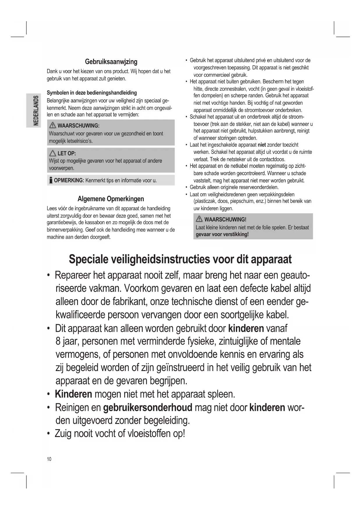 - Dit apparaat kan alleen worden gebruikt door kinderen vanaf 8 jaar, personen met verminderde fysieke, zintuiglijke of mentale vermogens, of personen met onvoldoende kennis en ervaring als zij begeleid worden of zijn geïnstrueerd in het veilig gebruik van het apparaat en de gevaren begrijpen.