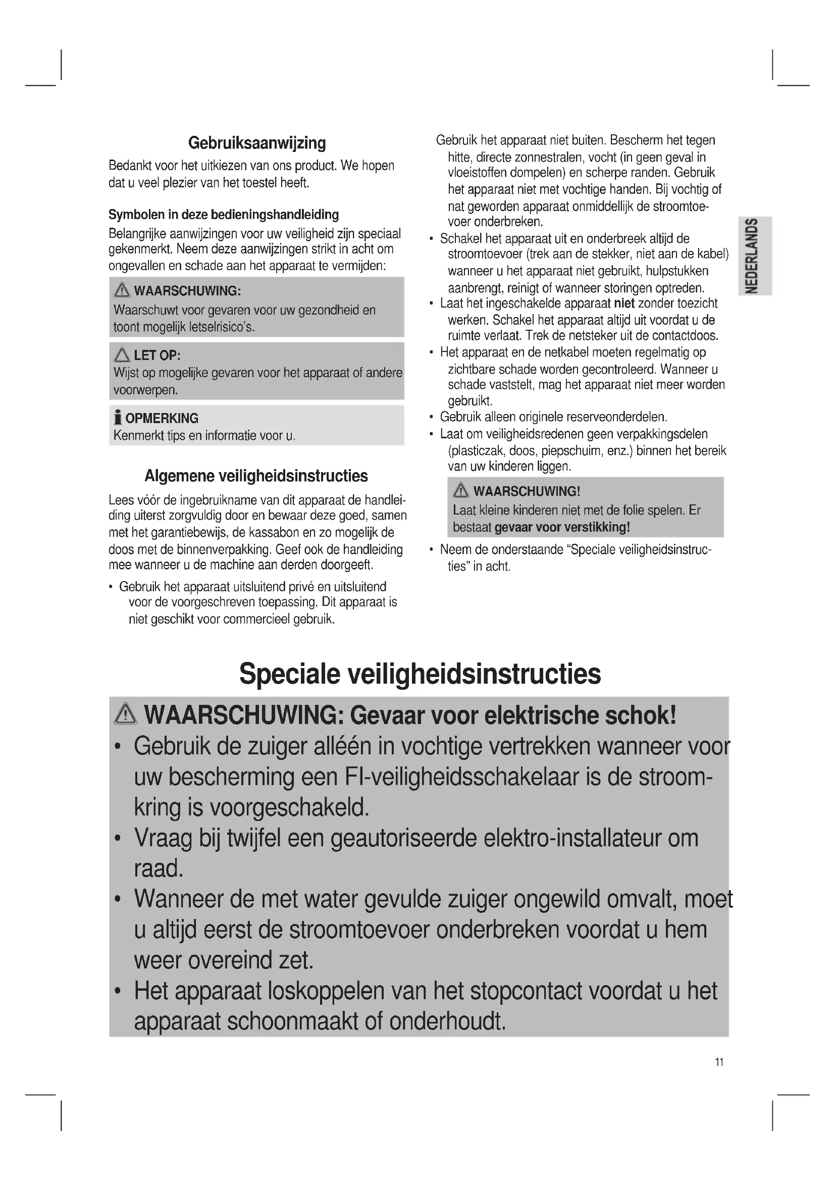 - Gebruik de zuiger alléén in vochtige vertrekken wanneer voor uw bescherming een FI-veiligheidsschakelaar is de stroom- kring is voorgeschakeld.