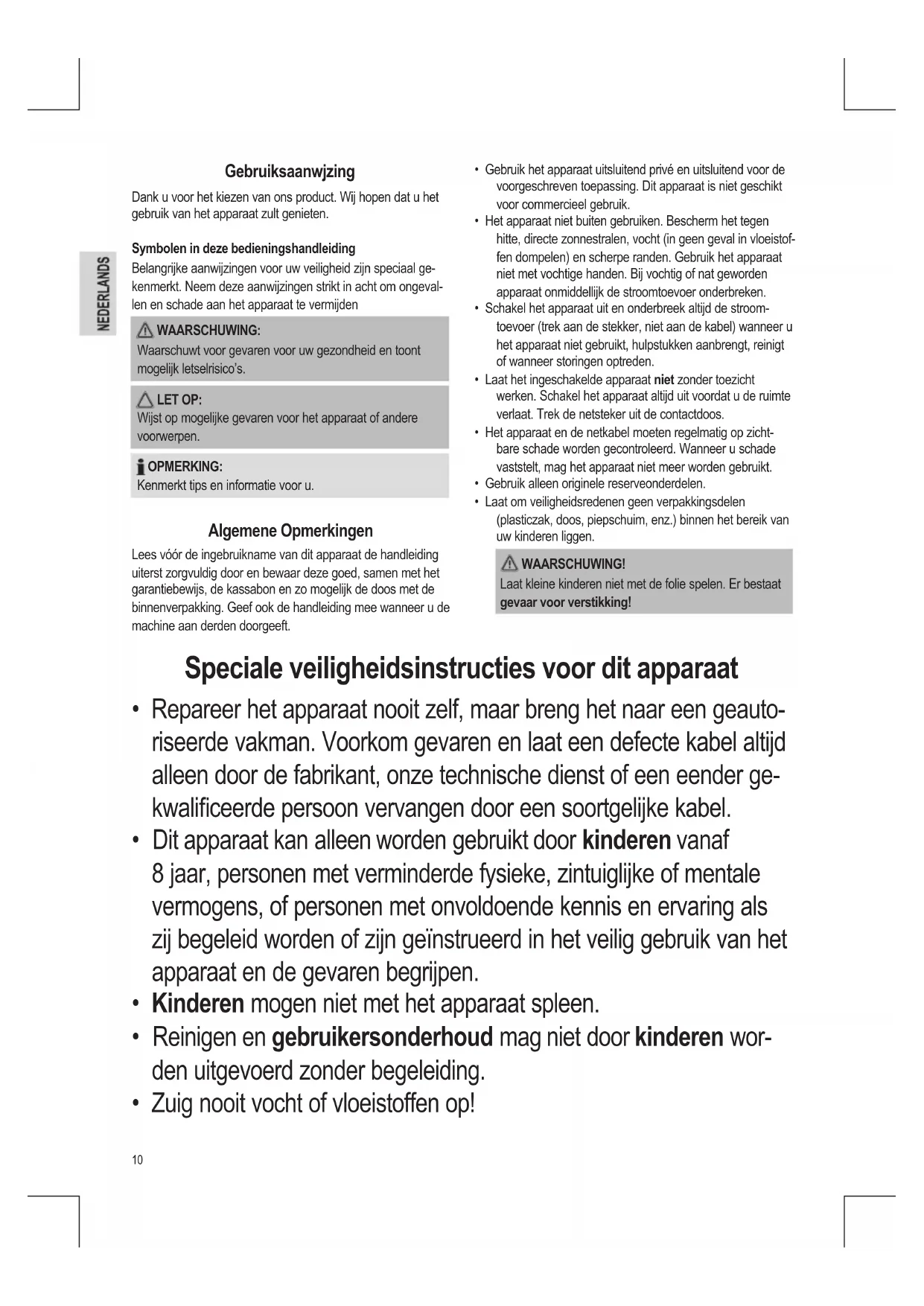 - Dit apparaat kan alleen worden gebruikt door kinderen vanaf 8 jaar, personen met verminderde fysieke, zintuiglijke of mentale vermogens, of personen met onvoldoende kennis en ervaring als zij begeleid worden of zijn geïnstrueerd in het veilig gebruik van het apparaat en de gevaren begrijpen.