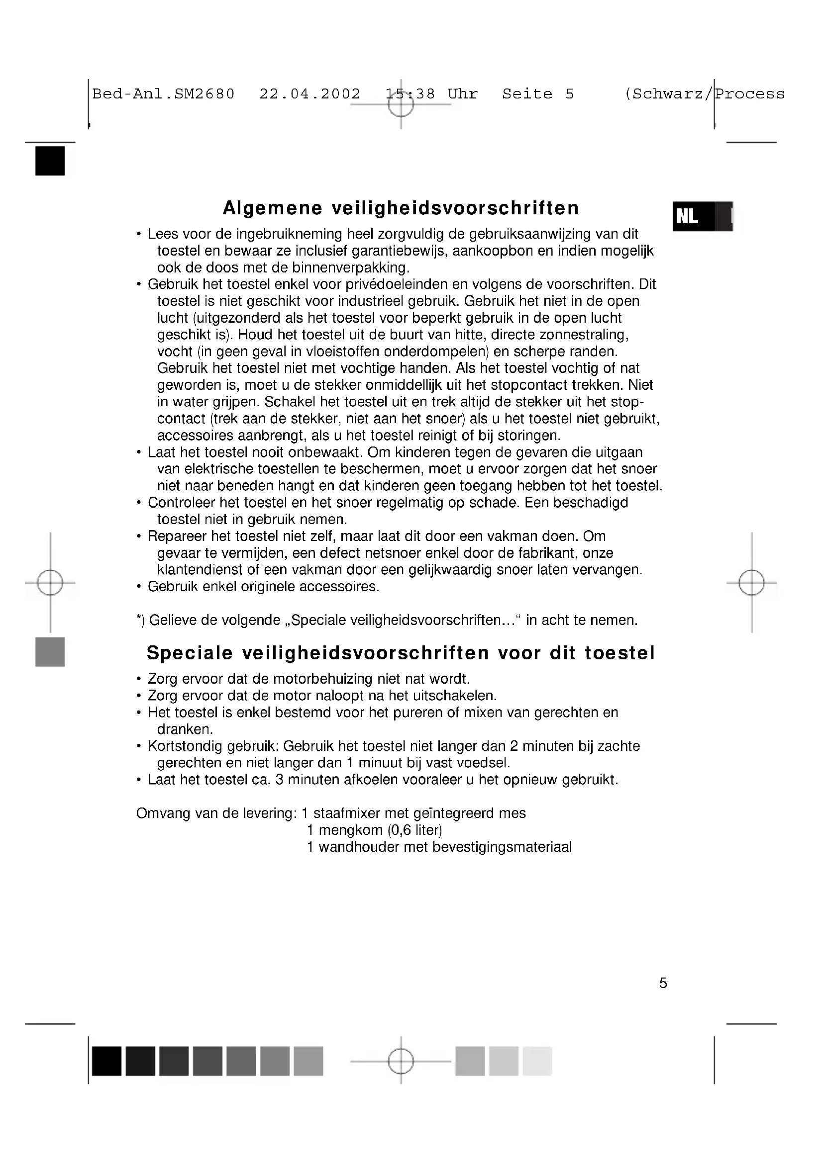 zoals in "Reinigen en bewaren" beschreven Reinigen en bewaren Trek de stekker voor het reinigen altijd uit het stopcontact! Reinig de mengkom met water of in gewoon afwaswater. Om de mixerstaaf te rei- nigen, vult u de mengkom met water en laat u de mixer draaien zoals in "Gebruik van het toestel" beschreven. Droog de mixerstaaf daarna goed af. Opgelet! Het mes van de mixerstaaf is heel scherp. Er bestaat gevaar voor verwondingen! Wrijf de buitenkant van de motorbehuizing eventueel met een vochtige doek af en daarna met een droge doek. Bewaar de mixerstaaf na het reinigen in de bijgeleverde wandhouder. Dit toestel voldoet aan de betreffende CE-richtlijnen en is conform de nieuwste veiligheidstechnische voorschriften geconstrueerd. Technische wijzigingen voorbehouden! Garantie We verlenen voor het door ons verkochte toestel een garantie van 24 maanden vanaf aankoopdatum (aankoopbon). Binnen deze garantieperiode verhelpen wij gratis de defecten van het toestel of van de accessoires*) die veroorzaakt zijn door materiaal- of productiefouten. NLL Bed-Anl.SM2680 22.04.2002 15:38 Uhr Seite 6 (Schwarz/Process7 In dergelijke gevallen zullen we het toestel ofwel repareren of, indien nodig, vervangen. Garantieprestaties verlengen de garantietermijn niet, ook kunt u hierdoor geen aanspraak maken op een nieuwe garantie! Als garantiebewijs geldt de aankoopbon. Zonder dit bewijs kan uw toestel niet kostenloos gerepareerd of vervangen worden. In het geval van prestaties die onder de garantie vallen, dient u het volledige toestel in de originele verpakking samen met de aankoopbon aan uw leverancier af te geven. *) Accessoires vallen onder de wettelijke aansprakelijkheidsplicht (6 maanden), die leidt niet tot het kostenloos vervangen van het volledige toestel. Neem in dit geval contact op met onze hotline! Aan glasschade of breuk van kunststof delen zijn kosten verbonden! Zowel defecten aan verbruikstoebehoren of slijtdelen (b.v. motorkool, kneedhaak, aandrijfriem, reserveafstandsbediening, reservetandenborstels, zaagbladen enz.) alsook het reinigen, onderhouden of vervangen van slijtdelen, vallen niet onder de garantie. Hieraan zijn dus kosten verbonden. De garantie vervalt als vreemden ingrepen in het toestel uitvoeren. Na de garantie Na het verstrijken van de garantietijd kunnen reparaties (met kosten) door de vakhandelaar of de reparatieservice uitgevoerd worden.