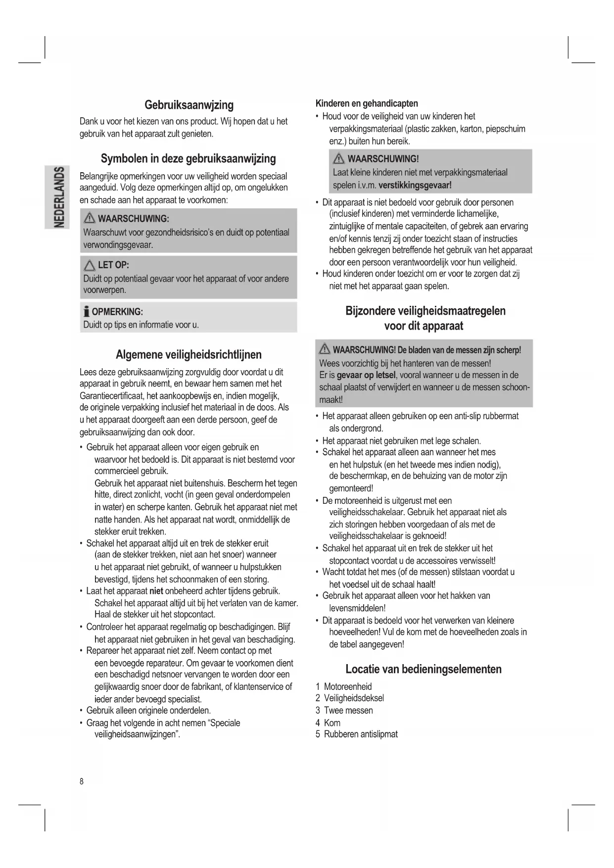 - Dit apparaat is bedoeld voor het verwerken van kleinere hoeveelheden! Vul de kom met de hoeveelheden zoals in de tabel aangegeven! Locatie van bedieningselementen 1 Motoreenheid 2 Veiligheidsdeksel 3 Twee messen 4 Kom 5 Rubberen antislipmat Gebruiksaanwjzing Dank u voor het kiezen van ons product. Wij hopen dat u het gebruik van het apparaat zult genieten. Symbolen in deze gebruiksaanwijzing Belangrijke opmerkingen voor uw veiligheid worden speciaal aangeduid. Volg deze opmerkingen altijd op, om ongelukken en schade aan het apparaat te voorkomen: WAARSCHUWING: Waarschuwt voor gezondheidsrisico’s en duidt op potentiaal verwondingsgevaar. LET OP: Duidt op potentiaal gevaar voor het apparaat of voor andere voorwerpen. OPMERKING: Duidt op tips en informatie voor u. Algemene veiligheidsrichtlijnen Lees deze gebruiksaanwijzing zorgvuldig door voordat u dit apparaat in gebruik neemt, en bewaar hem samen met het Garantiecerticaat, het aankoopbewijs en, indien mogelijk, de originele verpakking inclusief het materiaal in de doos. Als u het apparaat doorgeeft aan een derde persoon, geef de gebruiksaanwijzing dan ook door.