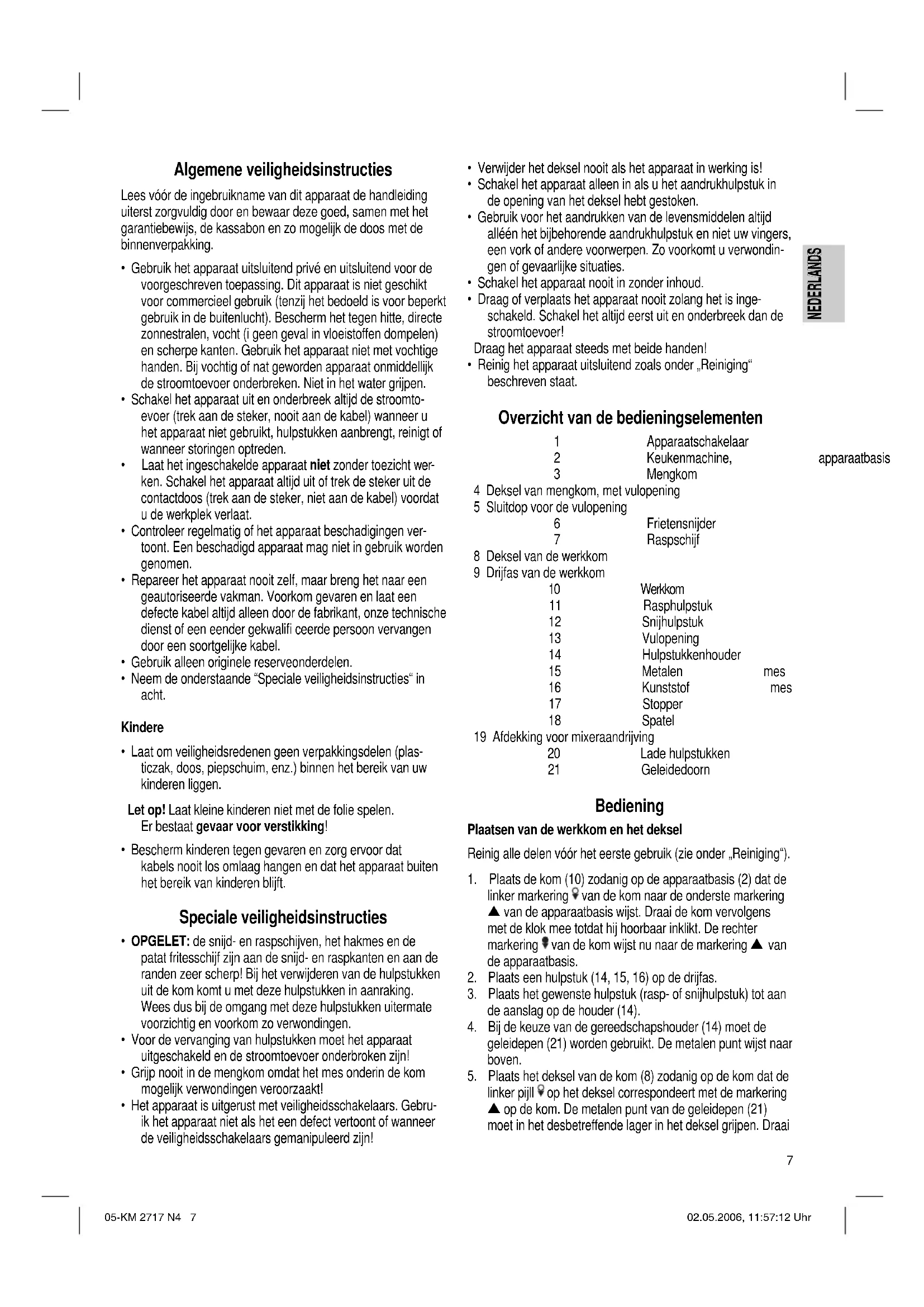 - Afneembare delen die met levensmiddelen in contact zijn gekomen (hulpstukken en kommen) kunt u gewoon afwas- sen. Technische gegevens Model: ..............................................................................KM 2717 Spanningstoevoer: ....................................................230 V, 50 Hz Opgenomen vermogen:......................................................700 W Beschermingsklasse:.................................................................. ΙΙ Dit apparaat is gekeurd conform de op dit moment van toepas- sing zijnde CE-richtlijnen zoals bijvoorbeeld elektromagnetische compatibiliteit en laagspanningsvoorschriften en is geconst- rueerd volgens de nieuwste veiligheidstechnische voorschriften. Technische wijzigingen voorbehouden! 05-KM 2717 N4 8 02.05.2006, 11:57:15 UhrNEDERLANDS