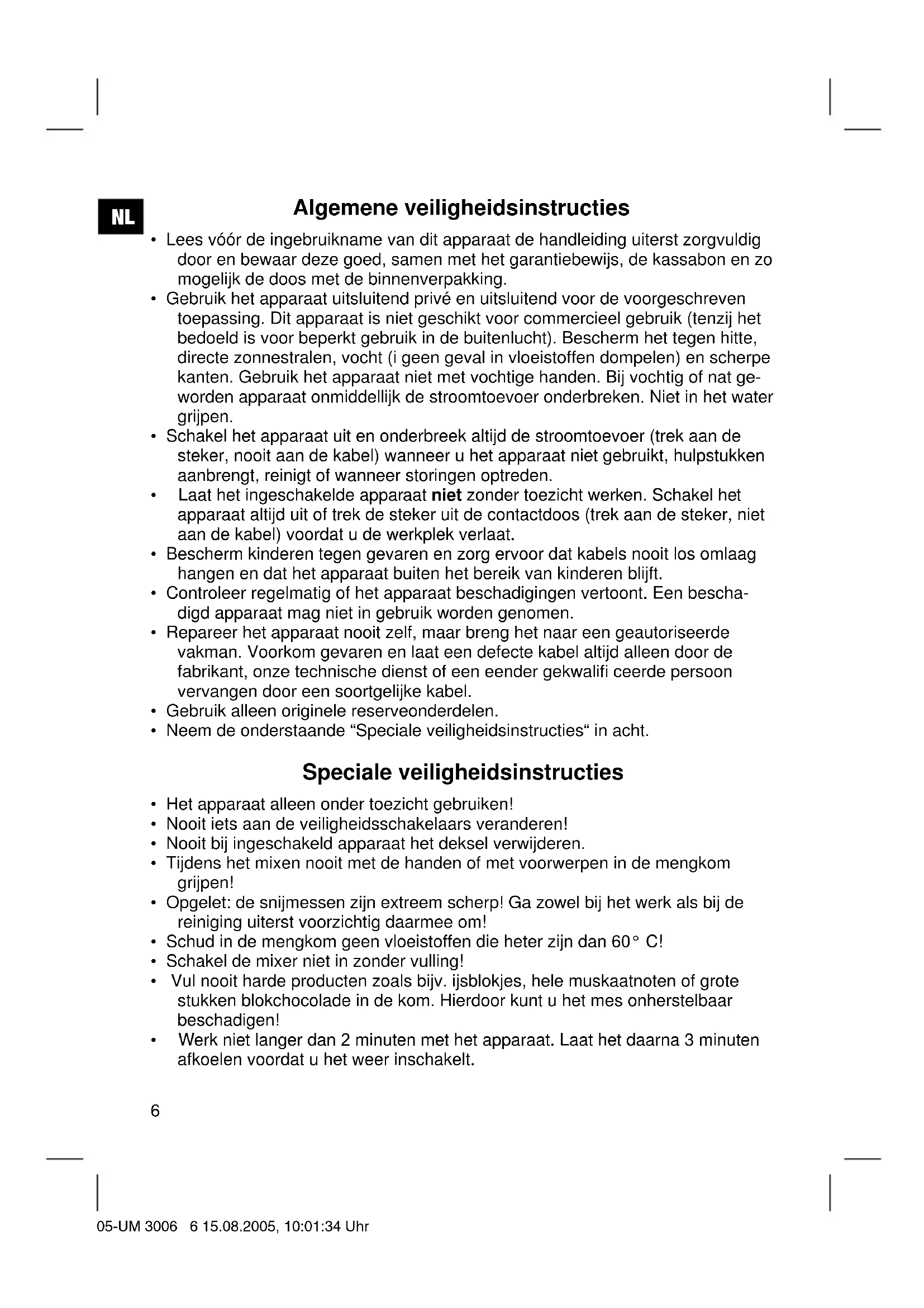 - Werk niet langer dan 2 minuten met het apparaat. Laat het daarna 3 minuten afkoelen voordat u het weer inschakelt. 05-UM 3006 6 15.08.2005, 10:01:34 UhrNL