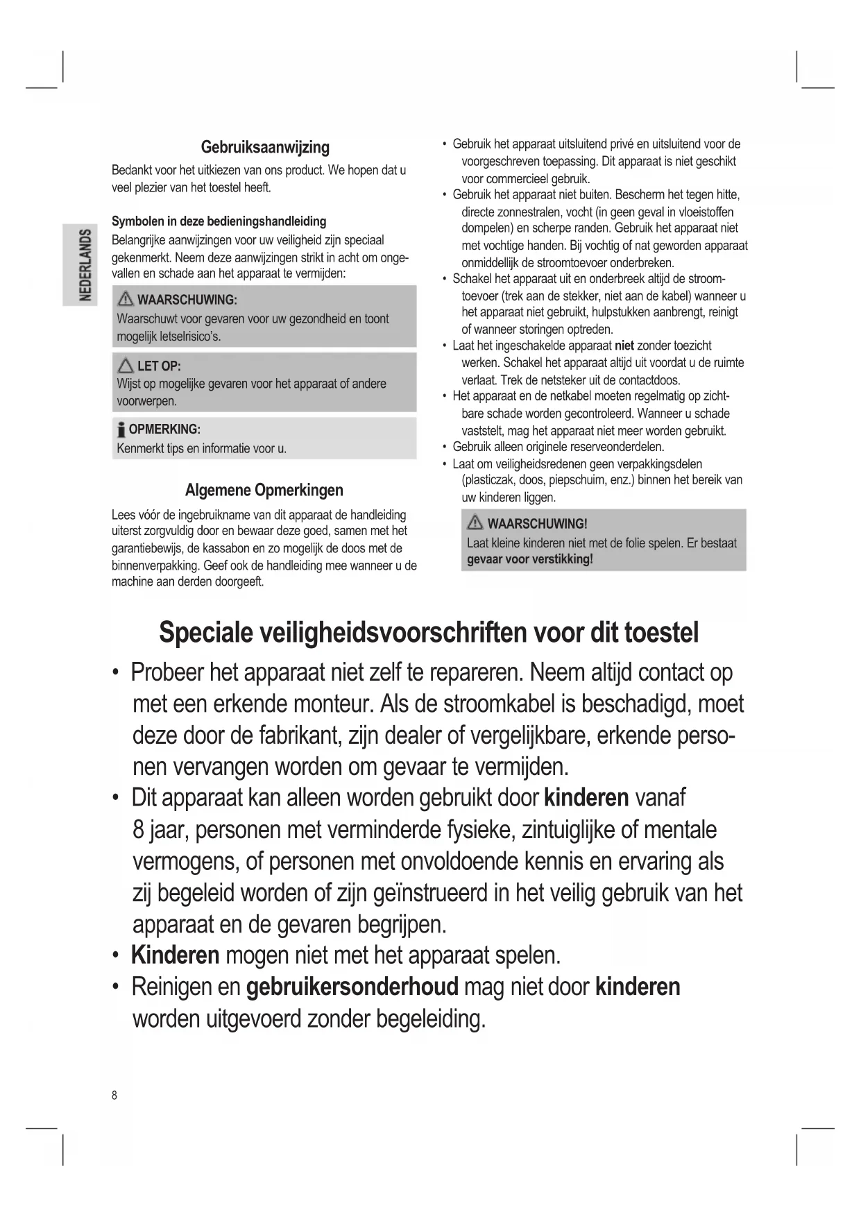 - Dit apparaat kan alleen worden gebruikt door kinderen vanaf 8 jaar, personen met verminderde fysieke, zintuiglijke of mentale vermogens, of personen met onvoldoende kennis en ervaring als zij begeleid worden of zijn geïnstrueerd in het veilig gebruik van het apparaat en de gevaren begrijpen.