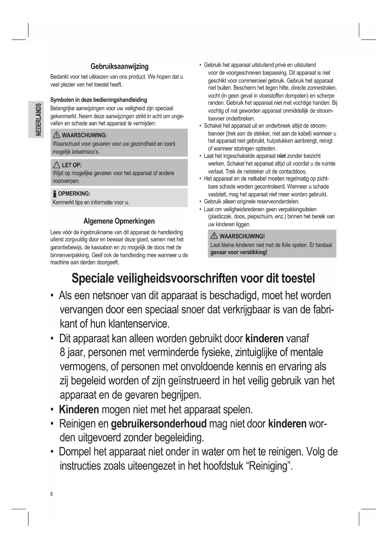 - Dit apparaat kan alleen worden gebruikt door kinderen vanaf 8 jaar, personen met verminderde fysieke, zintuiglijke of mentale vermogens, of personen met onvoldoende kennis en ervaring als zij begeleid worden of zijn geïnstrueerd in het veilig gebruik van het apparaat en de gevaren begrijpen.