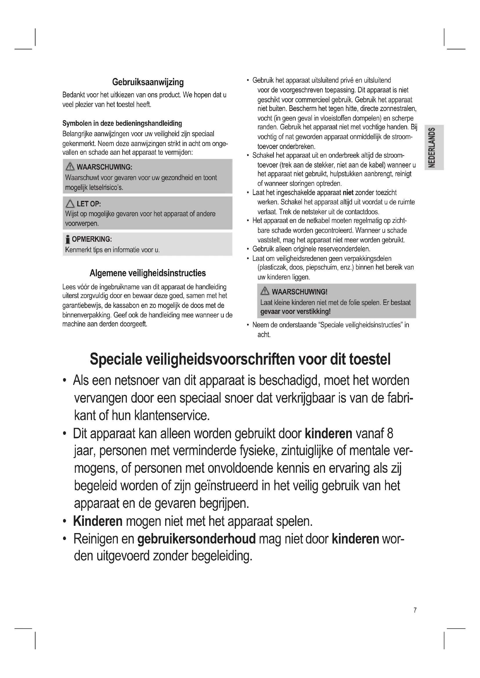 - Dit apparaat kan alleen worden gebruikt door kinderen vanaf 8 jaar, personen met verminderde fysieke, zintuiglijke of mentale ver- mogens, of personen met onvoldoende kennis en ervaring als zij begeleid worden of zijn geïnstrueerd in het veilig gebruik van het apparaat en de gevaren begrijpen.