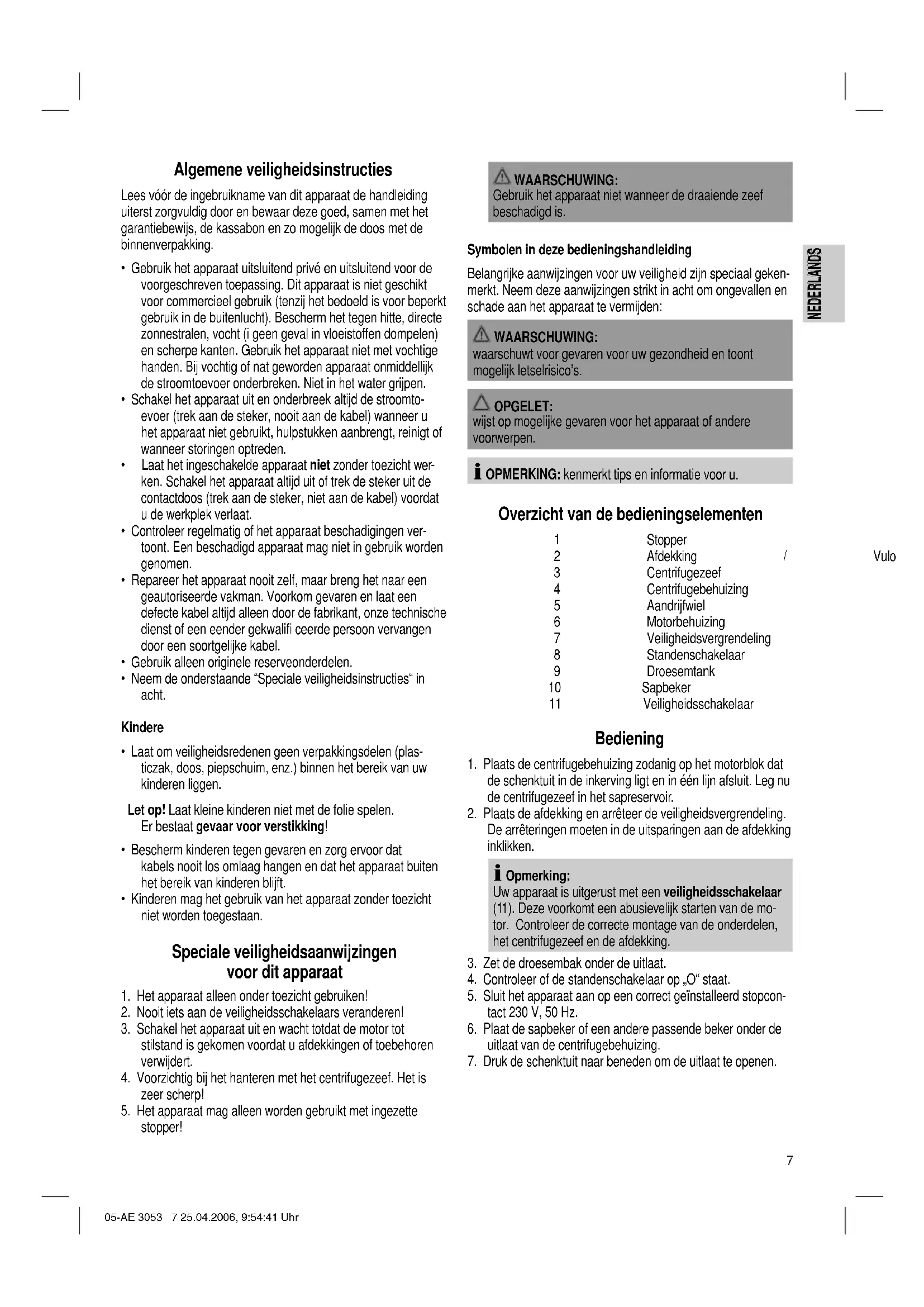 - Laat de onderdelen goed drogen voordat u het apparaat weer monteert. Verhelpen van storingen Apparaat functioneert niet. Maatregel: Controleer de netaansluiting. Controleer de positie van de schakelaar. Verdere mogelijke oorzaken: Uw apparaat is uitgerust met een veiligheidsschakelaar (11). Deze voorkomt het abusievelijk starten van de motor. Maatregel: Controleer de correcte montage van de onderdelen, de centrifu- gezeef en de afdekking. Technische gegevens Model: ..............................................................................AE 3053 Spanningstoevoer: ........................................220-240 V, 50/60 Hz Opgenomen vermogen:......................................................800 W Beschermingsklasse:................................................................... Ι Korte bedrijfstijd:...................................................................1 min. Dit apparaat is gekeurd conform de op dit moment van toepas- sing zijnde CE-richtlijnen zoals bijvoorbeeld elektromagnetische compatibiliteit en laagspanningsvoorschriften en is geconst- rueerd volgens de nieuwste veiligheidstechnische voorschriften. Technische wijzigingen voorbehouden! 05-AE 3053 8 25.04.2006, 9:54:47 UhrNEDERLANDS