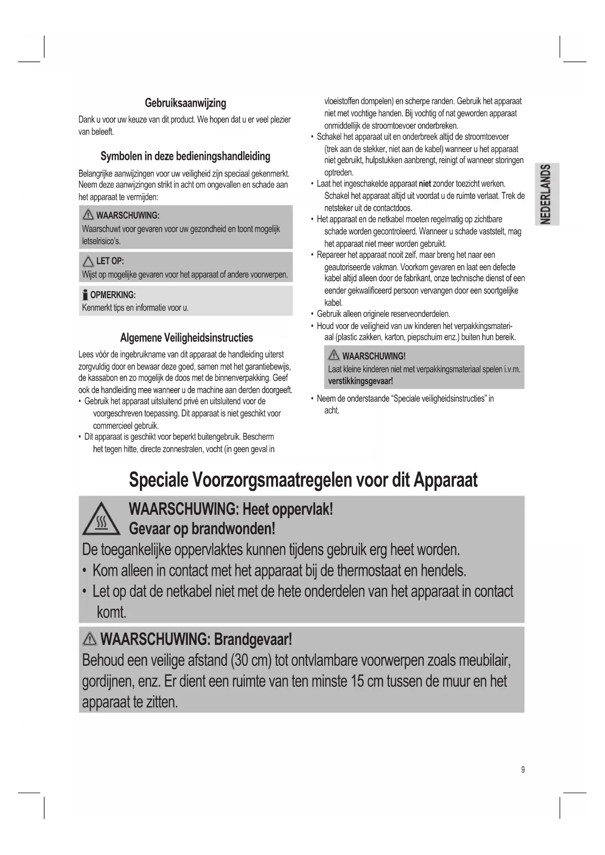 - Laat het ingeschakelde apparaat niet zonder toezicht werken. Schakel het apparaat altijd uit voordat u de ruimte verlaat. Trek de netsteker uit de contactdoos.