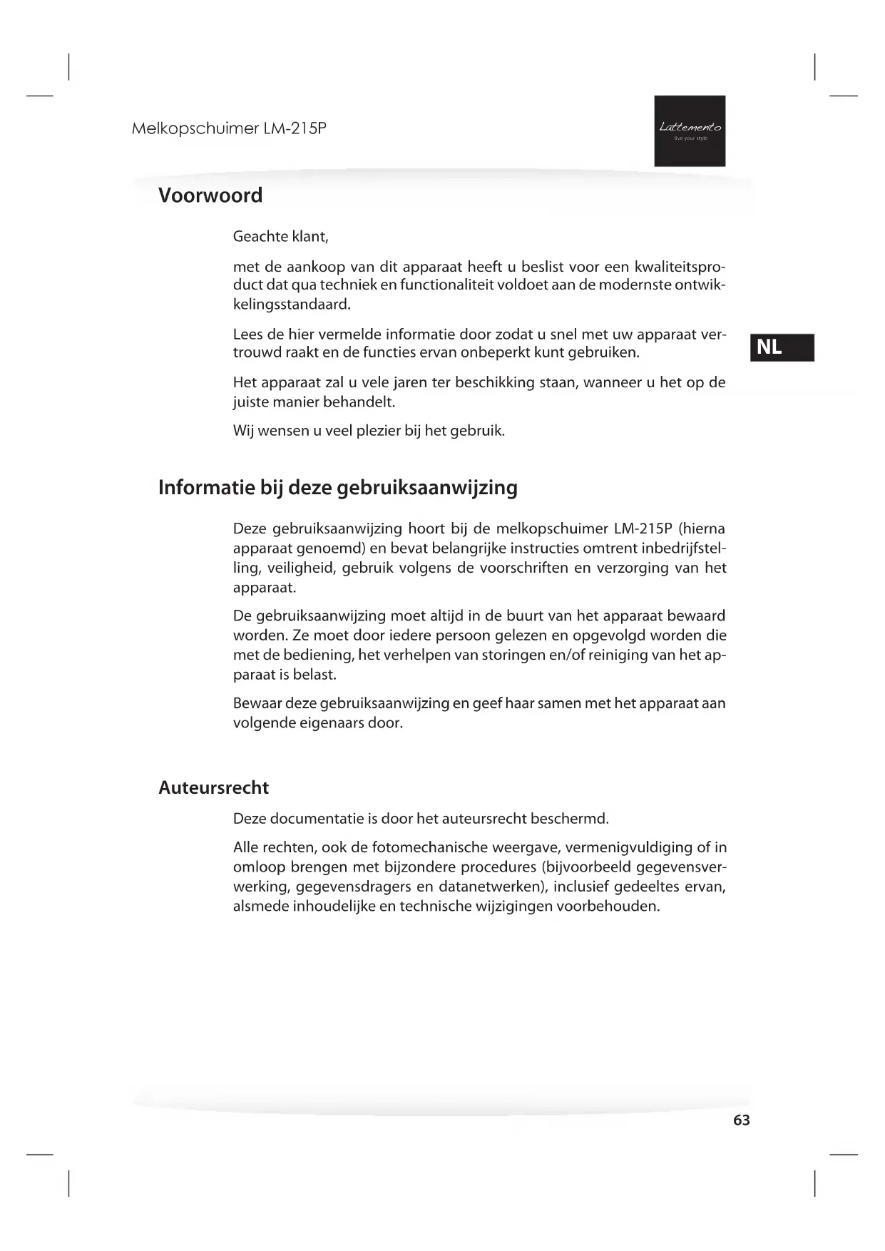 Deze gebruiksaanwijzing hoort bij de melkopschuimer LM-215P (hierna apparaat genoemd) en bevat belangrijke instructies omtrent inbedrijfstelling, verilgheid, gebruik volgens de voorschriften en verzorging van het apparaat.