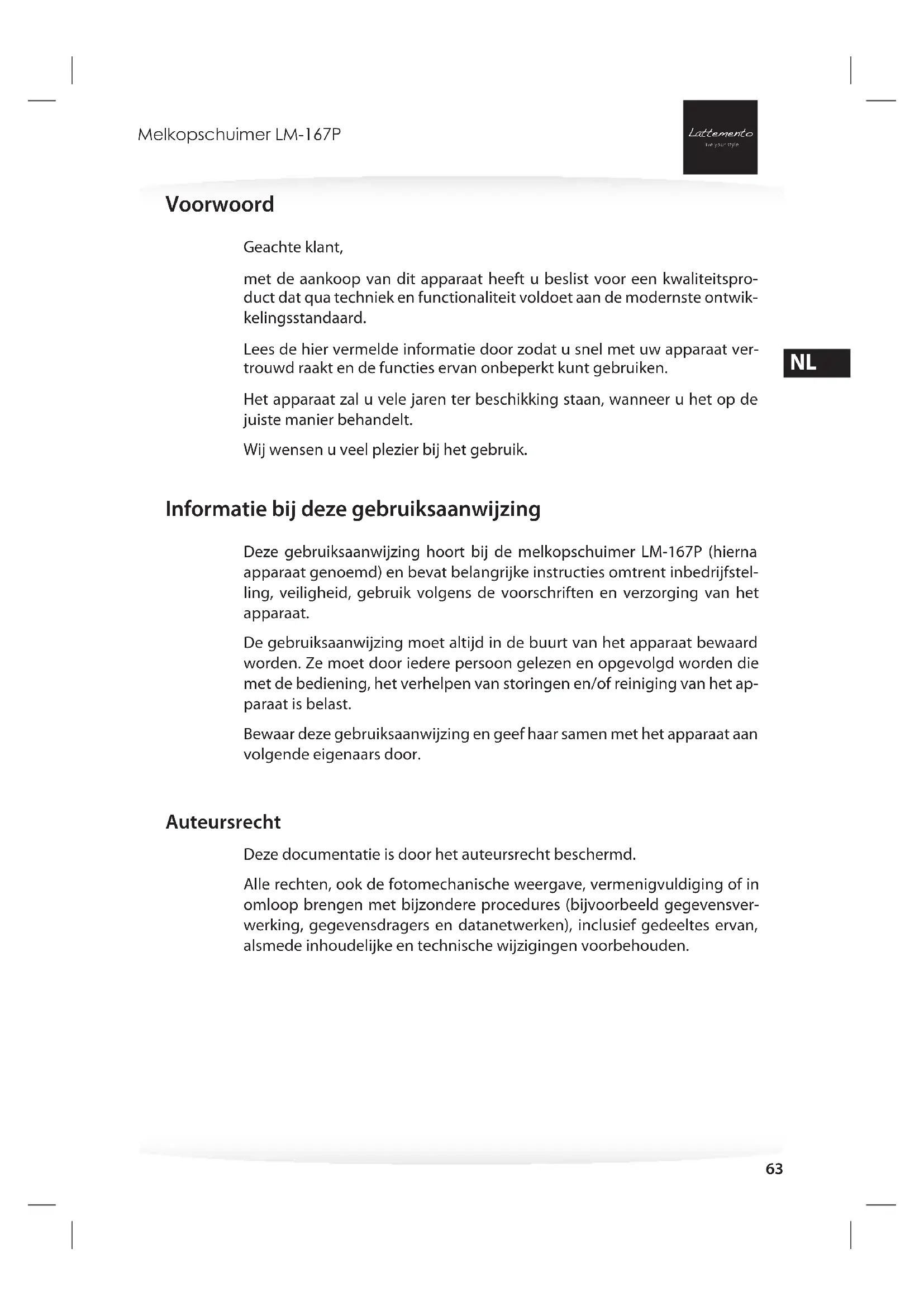 Deze gebruiksaanwijzing hoort bij de melkopschuimer LM-167P (hierna apparaat genoemd) en bevat belangrijke instructies omtrent inbedrijfstelling, verilgheid, gebruik volgens de voorschriften en verzorging van het apparaat.