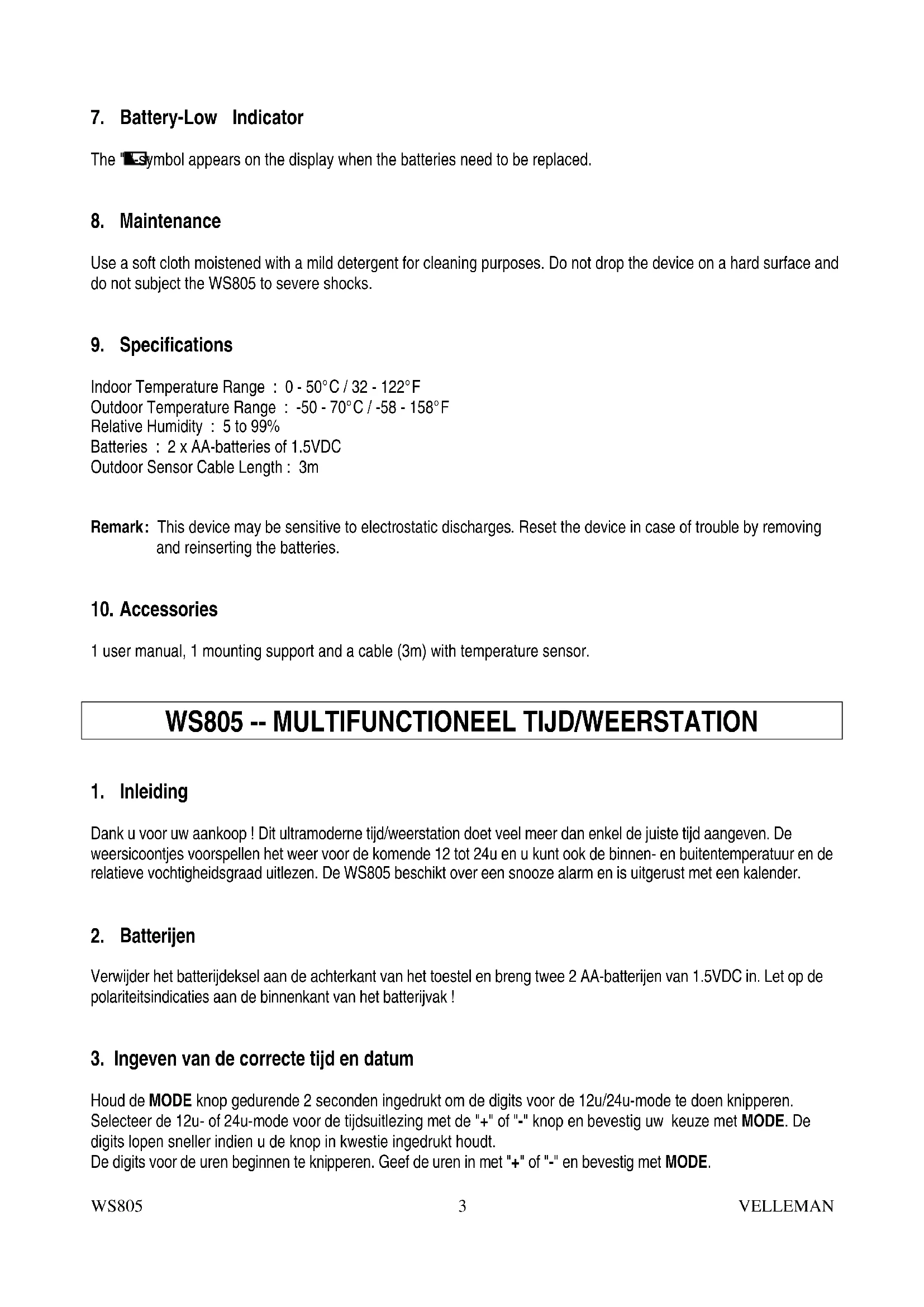 GEBRUIKSAANWIJZING WS805 VELLEMAN