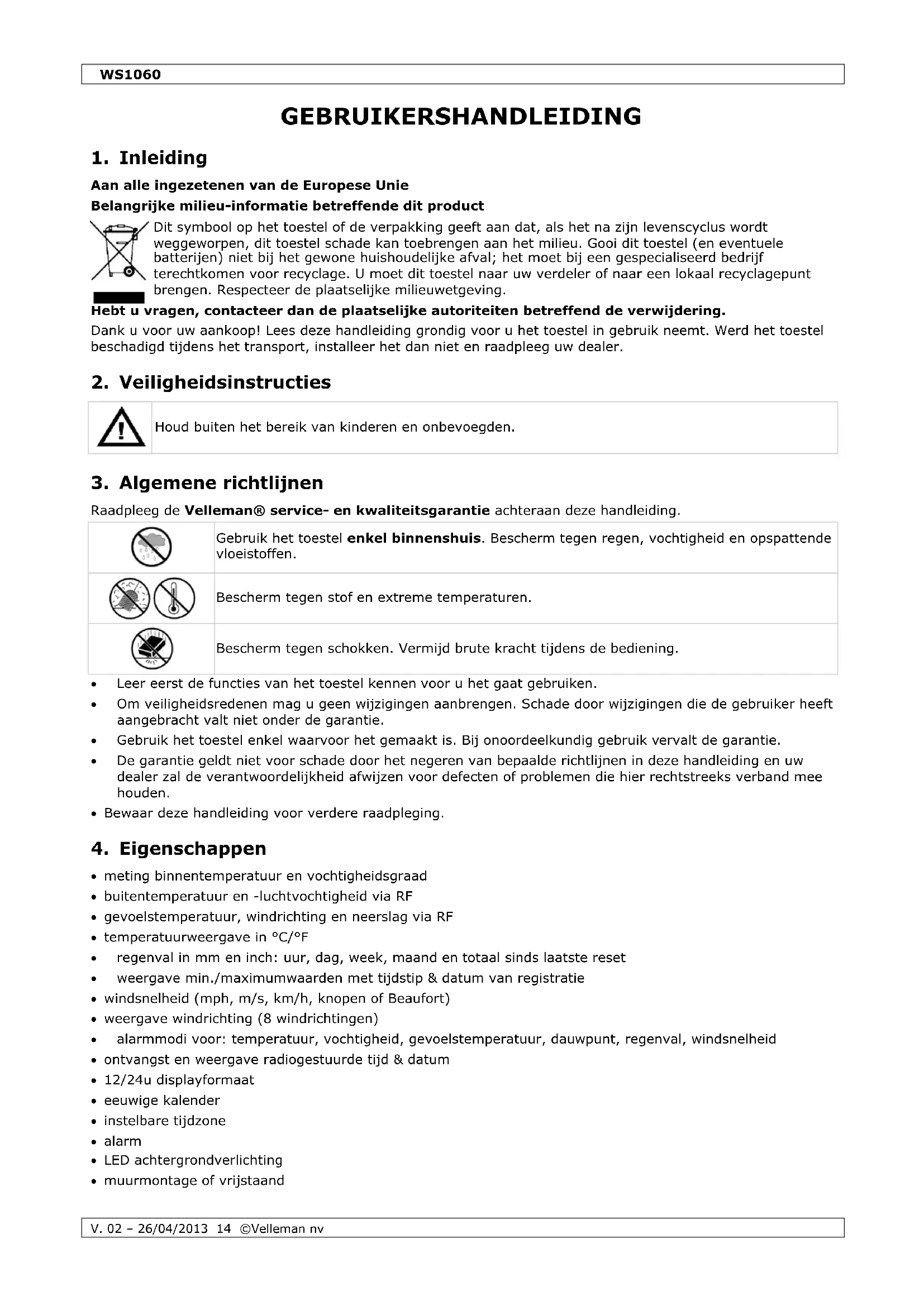 Gebruik dit toestel enkel met originele accessoires. Velleman nv is niet aansprakelijk voor schade of kwetsuren bij (verkeerd) gebruik van dit toestel. Voor meer informatie over dit product en de laatste versie van deze handleiding, zie www.velleman.eu. De informatie in deze handleiding kan te allen tijde worden gewijzigd zonder voorafgaande kennisgeving. © AUTEURSRECHT Velleman nv heeft het auteursrecht voor deze handleiding. Alle wereldwijde rechten voorbehouden. Het is niet toegestaan om deze handleiding of gedeelten ervan over te nemen, te kopiëren, te vertalen, te bewerken en op te slaan op een elektronisch medium zonder voorafgaande schriftelijke toestemming van de rechthebbende.WS1060