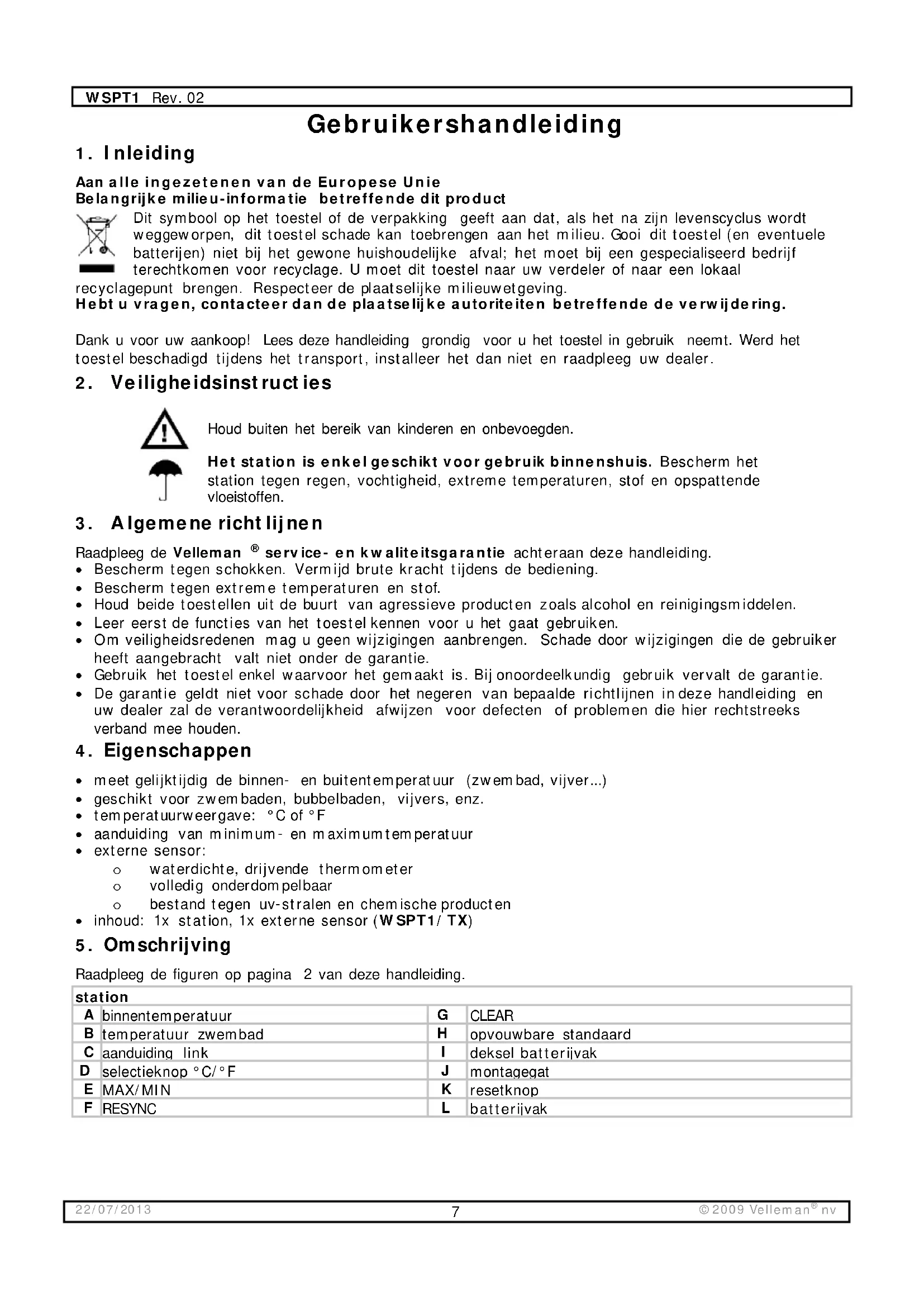 product en de laatste versie van deze handleiding, zie www.velleman.eu. De informatie in deze handleiding kan te allen tijde worden gewijzigd zonder voorafgaande kennisgeving. © AUTEURSRECHT Velleman nv heeft het auteursrecht voor deze handleiding. Alle wereldwijde rechten voorbehouden. Het is niet toegestaan om deze handleiding of gedeelten ervan over te nemen, te kopiëren, te vertalen, te bewerken en op te slaan op een elektronisch medium zonder voorafgaande schriftelijke toestemming van de rechthebbende.WSPT1 Rev. 02 22/07/2013 ©2009 Velleman