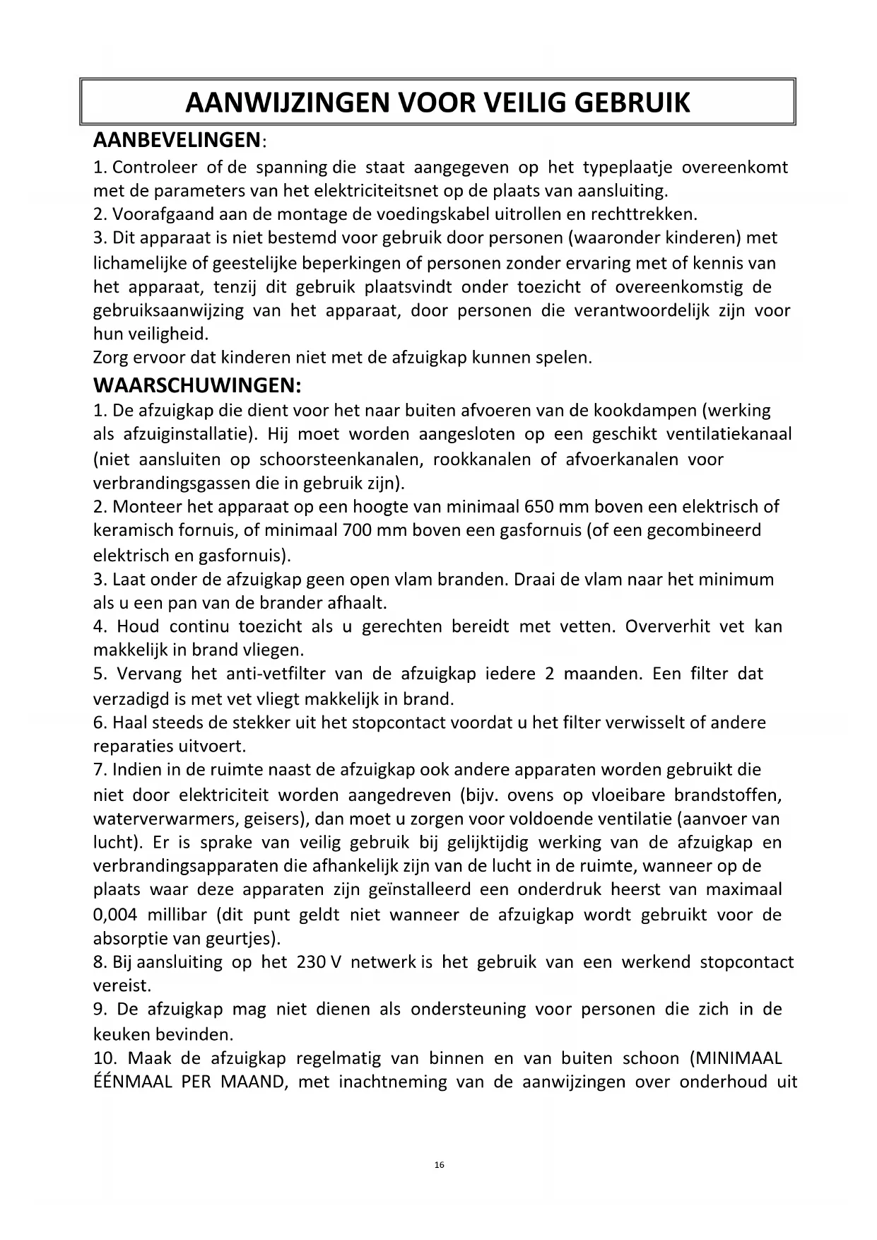 lichamelijke of geestelijke beperkingen of personen zonder ervaring met of kennis van het apparaat, tenzij dit gebruik plaatsvindt onder toezicht of overeenkomstig de gebruiksaanwijzing van het apparaat, door personen die verantwoordelijk zijn voor hun veiligheid. Zorg ervoor dat kinderen niet met de afzuigkap kunnen spelen. WAARSCHUWINGEN: