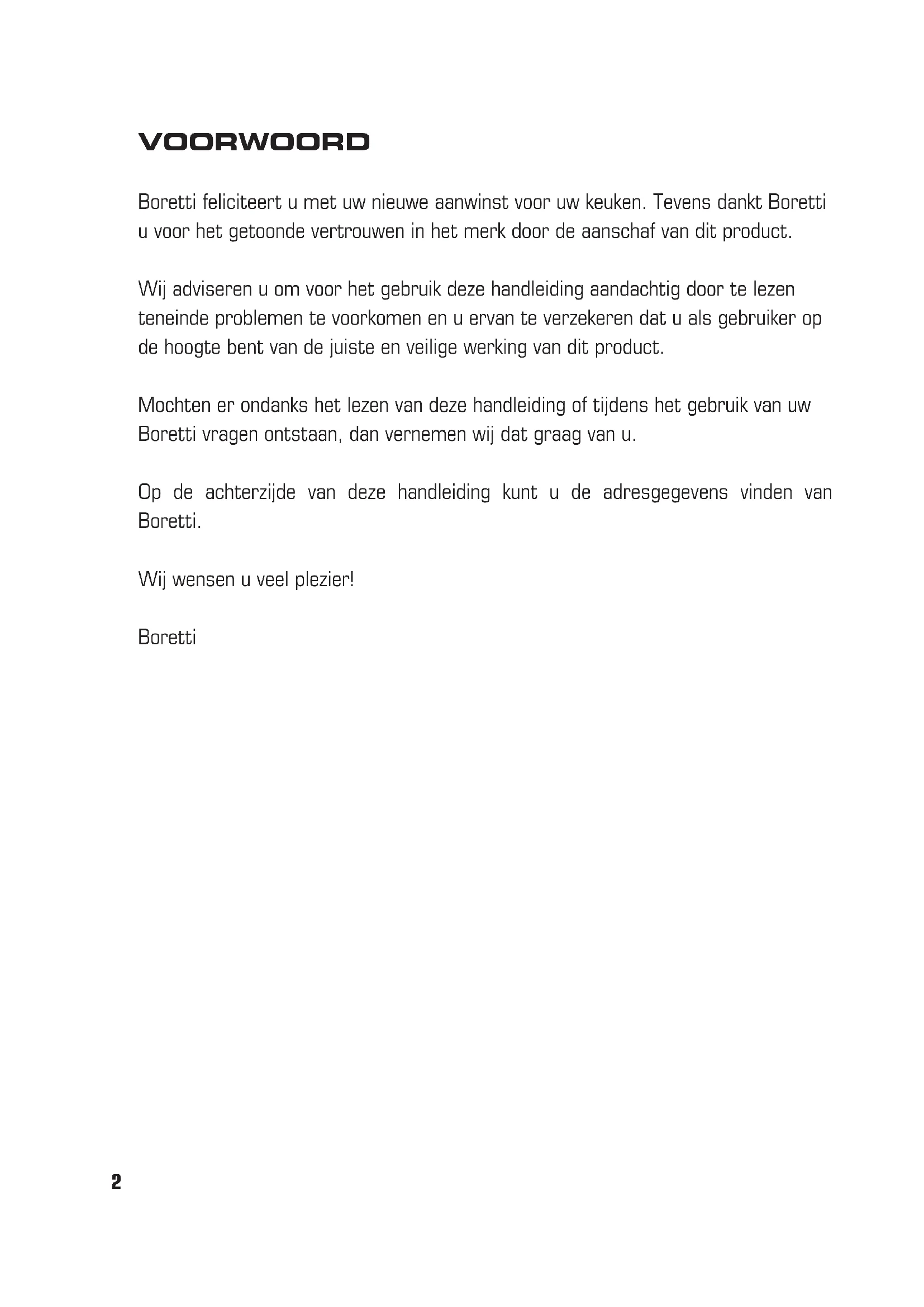 COOKER HOODS G E B R U I K S A A N W I J Z I N G N O T I C E D ’ E M P L O I M A N U A L D E U S O O P E R A T I N G I N S T R U C T I O N S ©Boretti B.V. COOKER HOODS-012 VOORWOORD Boretti feliciteert u met uw nieuwe aanwinst voor uw keuken. Tevens dankt Boretti u voor het getoonde vertrouwen in het merk door de aanschaf van dit product. Wij adviseren u om voor het gebruik deze handleiding aandachtig door te lezen teneinde problemen te voorkomen en u ervan te verzekeren dat u als gebruiker op de hoogte bent van de juiste en veilige werking van dit product. Mochten er ondanks het lezen van deze handleiding of tijdens het gebruik van uw Boretti vragen ontstaan, dan vernemen wij dat graag van u. Op de achterzijde van deze handleiding kunt u de adresgegevens vinden van Boretti. Wij wensen u veel plezier! BorettiNL