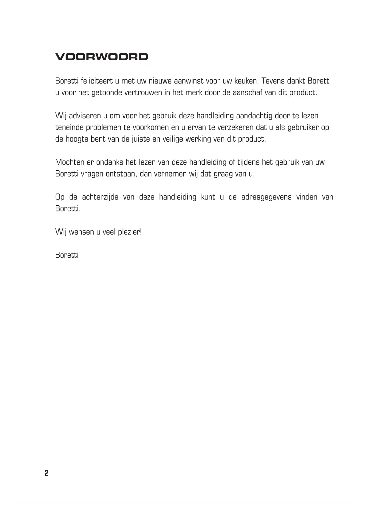 COOKER HOODS G E B R U I K S A A N W I J Z I N G N O T I C E D ’ E M P L O I M A N U A L D E U S O O P E R A T I N G I N S T R U C T I O N S ©Boretti B.V. COOKER HOODS-012 VOORWOORD Boretti feliciteert u met uw nieuwe aanwinst voor uw keuken. Tevens dankt Boretti u voor het getoonde vertrouwen in het merk door de aanschaf van dit product. Wij adviseren u om voor het gebruik deze handleiding aandachtig door te lezen teneinde problemen te voorkomen en u ervan te verzekeren dat u als gebruiker op de hoogte bent van de juiste en veilige werking van dit product. Mochten er ondanks het lezen van deze handleiding of tijdens het gebruik van uw Boretti vragen ontstaan, dan vernemen wij dat graag van u. Op de achterzijde van deze handleiding kunt u de adresgegevens vinden van Boretti. Wij wensen u veel plezier! BorettiNL