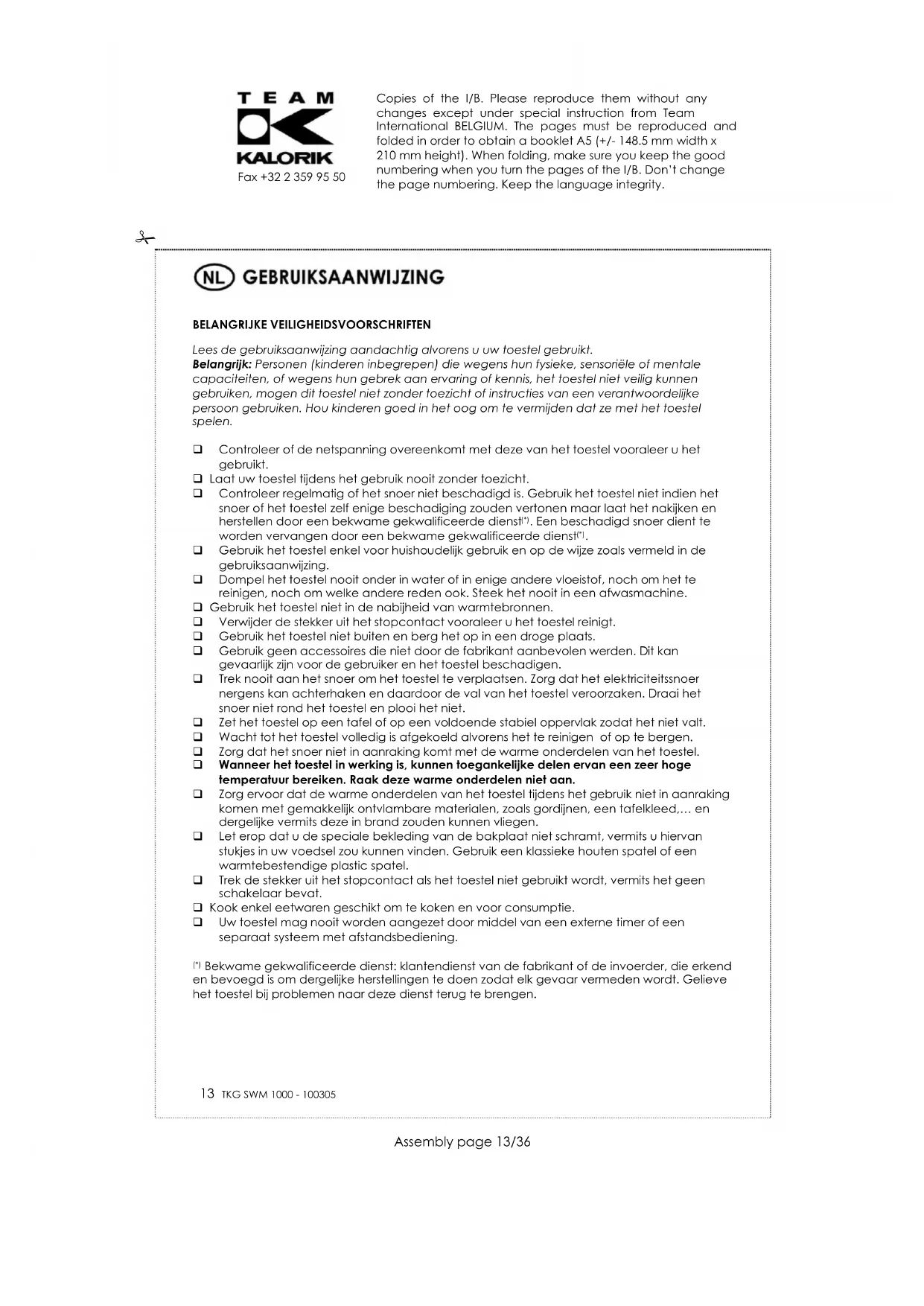 Om ons milieu en onze gezondheid te beschermen, moet afgedankte elektrische en elektronische apparatuur in overeenstemming met welbepaalde regels weggegooid worden. Dit vergt zowel de inzet van de leveranciers als van de gebruikers. Daarom mag uw apparaat, zoals op het typeplaatje of op de verpakking aangegeven door het symbool , niet met het gewone huisvuil weggegooid worden. De gebruiker heeft het recht het toestel naar een gemeentelijk centrum van gescheiden inzameling te brengen waar het overeenkomstig de richtlijn hergebruikt, gerecycleerd of voor andere doeleinden gebruikt zal worden. Copies of the I/B. Please reproduce them without any changes except under special instruction from Team International BELGIUM. The pages must be reproduced and folded in order to obtain a booklet A5 (+/- 148.5 mm width x 210 mm height). When folding, make sure you keep the good numbering when you turn the pages of the I/B. Don’t change the page numbering. Keep the language integrity.