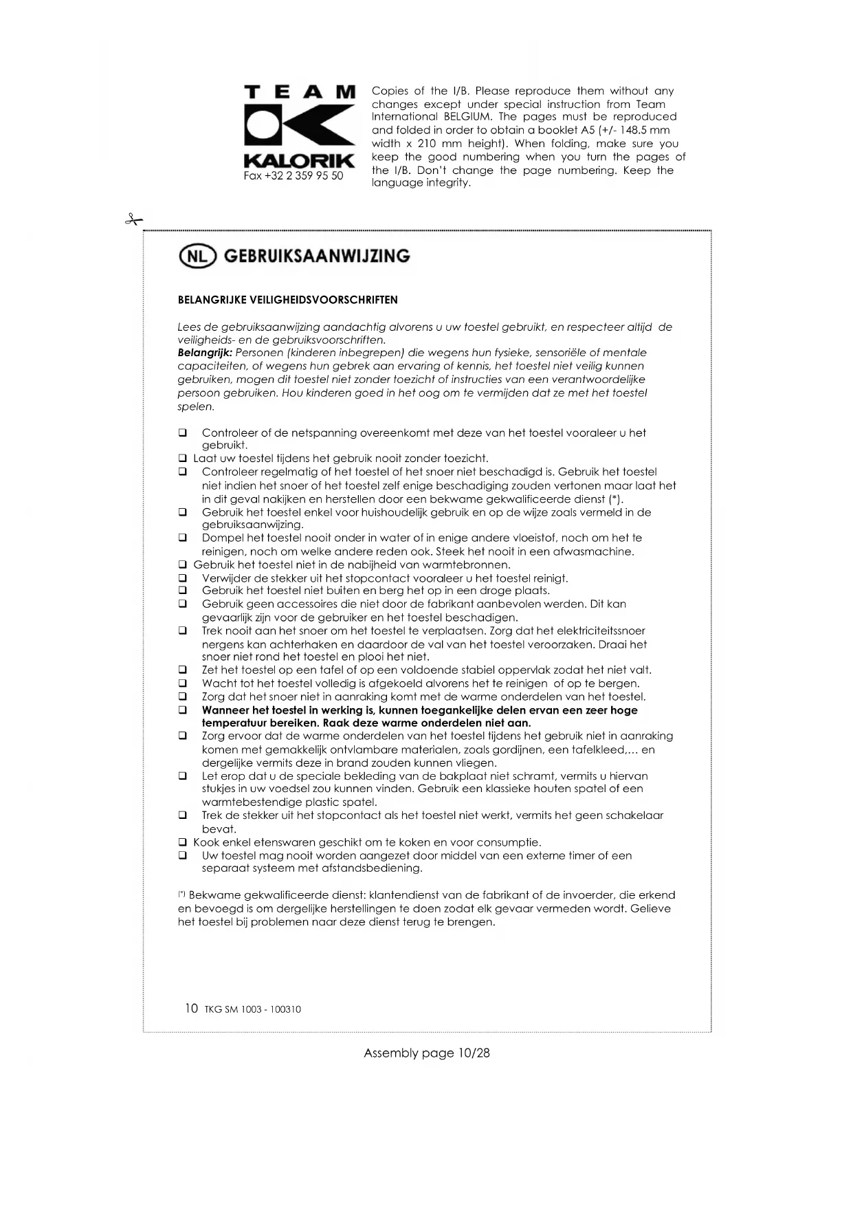 Om ons milieu en onze gezondheid te beschermen, moet afgedankte elektrische en elektronische apparatuur in overeenstemming met welbepaalde regels weggegooid worden. Dit vergt zowel de inzet van de leveranciers als van de gebruikers. Daarom mag uw apparaat, zoals op het typeplaatje of op de verpakking aangegeven door het symbool , niet met het gewone huisvuil weggegooid worden. De gebruiker heeft het recht het toestel naar een gemeentelijk centrum van gescheiden inzameling te brengen waar het overeenkomstig de richtlijn hergebruikt, gerecycleerd of voor andere doeleinden gebruikt zal worden. Copies of the I/B. Please reproduce them without any changes except under special instruction from Team International BELGIUM. The pages must be reproduced and folded in order to obtain a booklet A5 (+/- 148.5 mm width x 210 mm height). When folding, make sure you keep the good numbering when you turn the pages of the I/B. Don’t change the page numbering. Keep the language integrity.