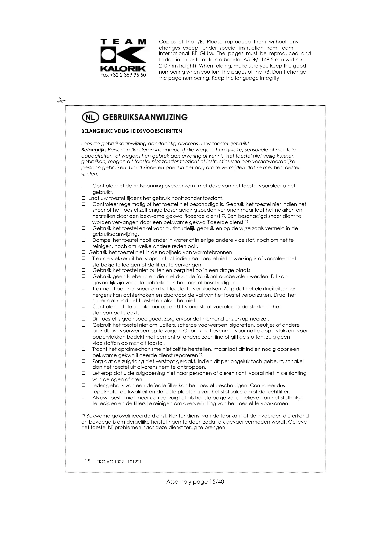 GEBRUIKSAANWIJZING TKG VC 1002 KALORIK