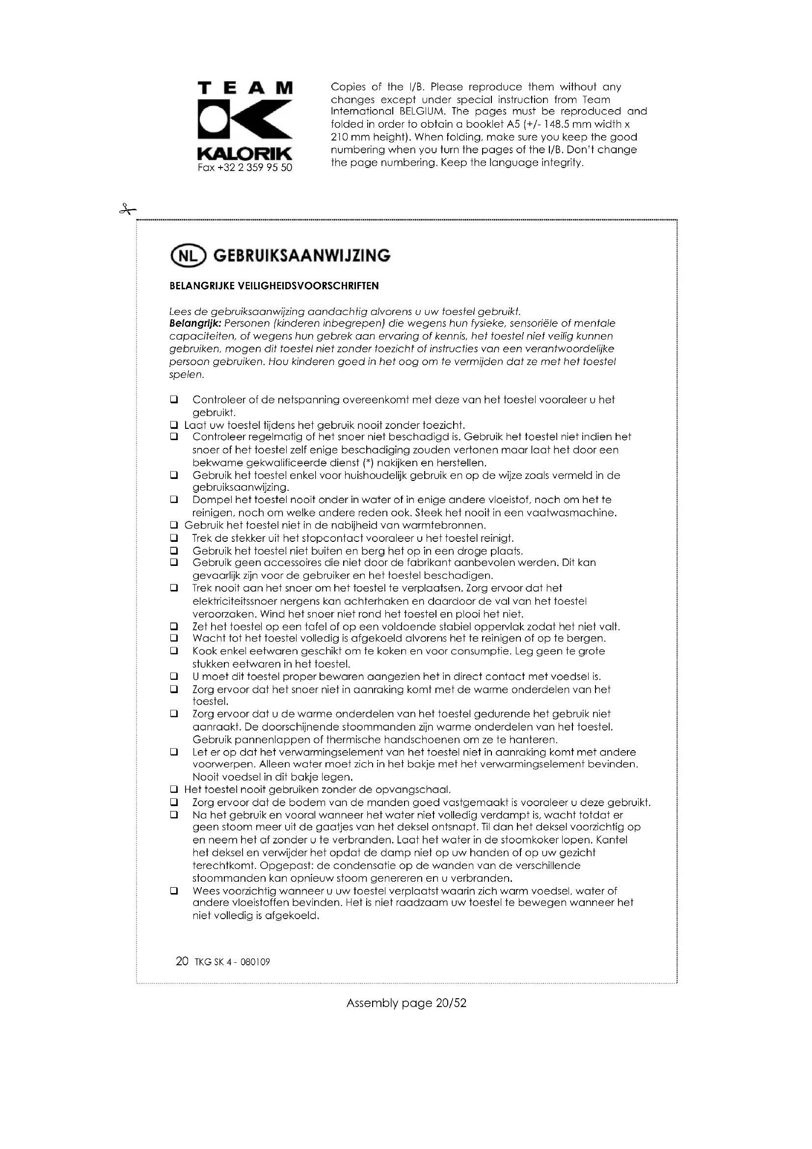 Zorg ervoor dat het snoer nog niet aangesloten is. Vul het waterreservoir met koud water. Giet het water langs de openingen van de handvaten (zie pagina 4). Let wel op dat u niet minder water gebruikt dan het minimale peil en niet meer water dan het maximale peil. Anders kan uw toestel beschadigd worden. Geen kruiden, specerijen of andere vloeistoffen zoals wijn of sausen in het waterreservoir toevoegen. Plaats de voedingsmiddelen in de verschillende stoommanden. Voeg geen kruiden toe vooraleer de kooktijd beëindigd is. Zorg ervoor dat het beschermingsstuk van het verwarmingselement op zijn plaats is en goed vastzit. Plaats dan de opvangschaal op het waterreservoir en stapel de verschillende stoommanden op elkaar op. Zorg er hierbij voor dat de grootste stoommand zich bovenaan bevindt. Wanneer u twee manden op elkaar stapelt, let er dan op dat ze perfect op elkaar passen. Om een mand correct te installeren: zorg ervoor dat de 4 kleine blokjes aan de onderkant van de bovenste mand in de gaatjes aan zowel de rechter- als de linkerkant van de onderste mand geschoven worden, en draai de handvaten van de onderste mand naar omhoog tot ze vastklikken. Dan zijn de manden stevig aan elkaar vastgemaakt. Opgepast: wees voorzichtig gedurende deze handeling, want als de accessoires slecht geplaatst zijn, kan stoom uit het toestel ontsnappen en kunt u brandwonden oplopen. Leg het deksel op de bovenste stoommand. GEBRUIK HET TOESTEL NIET ZONDER DEKSEL! ER ONTSTAAT STOOM TIJDENS HET GEBRUIK. Om het deksel correct te installeren: zorg ervoor dat de kleine blokjes aan de onderkant van het deksel in de gaatjes aan zowel de rechter- als de linkerkant van de bovenste mand geschoven worden. Druk op het deksel en draai de handvaten van de mand omhoog tot ze vastklikken om zo het deksel stevig te sluiten. Steek de stekker in het stopcontact. Het rode controlelampje zal branden. Stel de kooktijd in door de tijdschakelaar in wijzerszin te draaien. Het groene controlelampje zal ook branden om aan te geven dat het toestel in werking is getreden. Wanneer de ingestelde tijd verstreken is, luidt een belsignaal en schakelt het toestel zich automatisch uit. Opgepast: de maximale waterhoeveelheid in de watertank van het toestel kan gedurende ongeveer 90 minuten stoom genereren. Als de geprogrammeerde kooktijd langer dan 90 minuten is, moet u de watertank tijdens het gebruik bijvullen. Om te weten of de watertank leeg is, moet u controleren of geen stoom meer ontsnapt of op de waterpeilaanduiding kijken. Om de watertank te vullen, voeg koud water toe zoals beschreven op pagina 4. OPGEPAST: In het begin zal stoom geproduceerd worden (de hoeveelheid stoom hangt af van de tijd waarin het stoomelement uitgeschakeld is gebleven). Opgepast zichzelf niet te verbranden. Om het voedsel te controleren, wacht tot er geen stoom meer uit de gaatjes van het deksel ontsnapt. Draai dan de handvaten van de bovenste mand naar beneden om het deksel te openen. (Opgelet: neem het deksel langzaam weg, want er kan nog stoom ontsnappen en condensatie langs de wanden vloeien). OPGEPAST: HET STOOMMANDJE EN HET STOOMELEMENT NIET AANRAKEN. Controleer met een lange vork of priem of het voedsel gaar is. Copies of the I/B. Please reproduce them without any changes except under special instruction from Team International BELGIUM. The pages must be reproduced and folded in order to obtain a booklet A5 (+/- 148.5 mm width x 210 mm height). When folding, make sure you keep the good numbering when you turn the pages of the I/B. Don’t change the page numbering. Keep the language integrity.