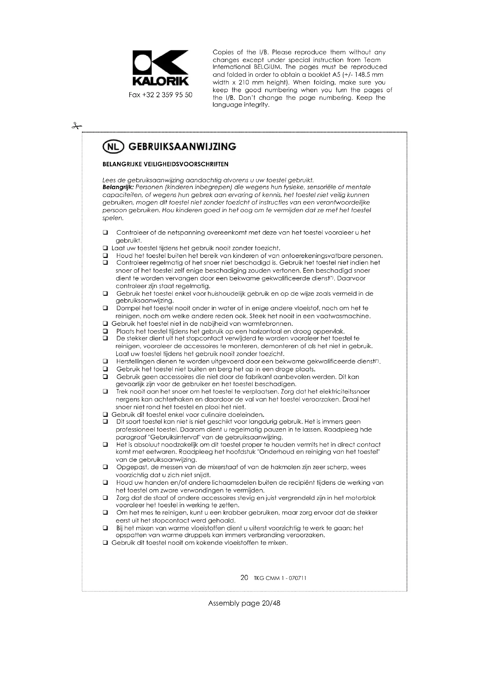 Om ons milieu en onze gezondheid te beschermen, moet afgedankte elektrische en elektronische apparatuur in overeenstemming met welbepaalde regels weggegooid worden. Dit vergt zowel de inzet van de leveranciers als van de gebruikers. Om deze reden mag uw apparaat, zoals op het typeplaatje of op de verpakking aangegeven door het symbool , niet met het gewone huisvuil weggegooid worden. De gebruiker heeft het recht het toestel gratis naar een gemeentelijk centrum van gescheiden inzameling te brengen waar het overeenkomstig de richtlijn hergebruikt, gerecycleerd of voor andere doeleinden gebruikt zal worden. Copies of the I/B. Please reproduce them without any changes except under special instruction from Team International BELGIUM. The pages must be reproduced and folded in order to obtain a booklet A5 (+/- 148.5 mm width x 210 mm height). When folding, make sure you keep the good numbering when you turn the pages of the I/B. Don’t change the page numbering. Keep the language integrity.