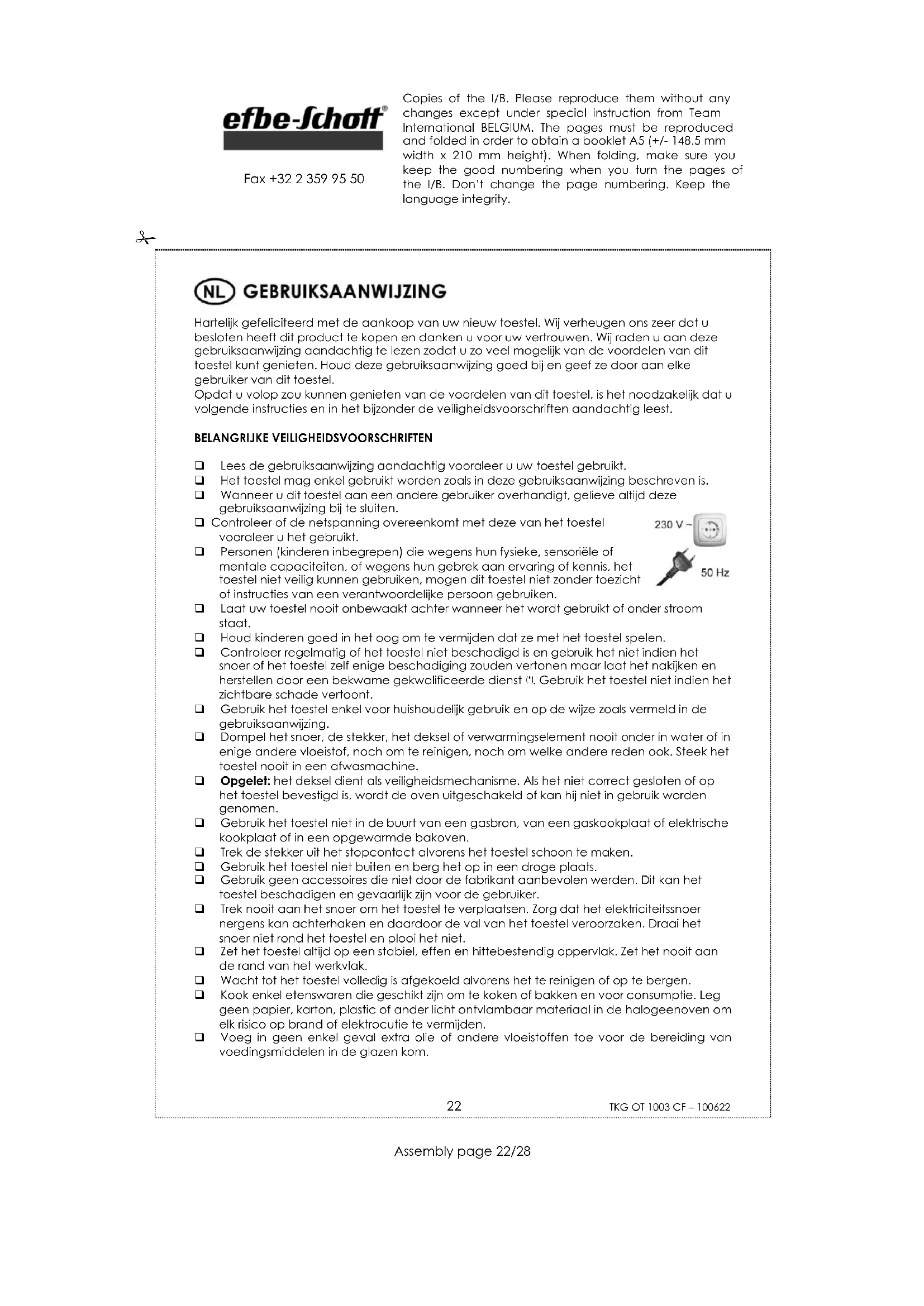 Pak het toestel en de accessoires uit, spoel de accessoires en droog ze af. Neem de halogeenoven uitsluitend op een effen, stabiel en hittebestendig oppervlak in gebruik. Het is normaal dat rook en geur ontsnappen wanneer u uw toestel voor de eerste maal gebruikt. Daarom is het raadzaam eerst het toestel leeg te laten werken vóór het eerste gebruik. Zet daartoe de timer op ongeveer 10 minuten en de thermostaat op maximale stand (250°C). Copies of the I/B. Please reproduce them without any changes except under special instruction from Team International BELGIUM. The pages must be reproduced and folded in order to obtain a booklet A5 (+/- 148.5 mm width x 210 mm height). When folding, make sure you keep the good numbering when you turn the pages of the I/B. Don’t change the page numbering. Keep the language integrity.