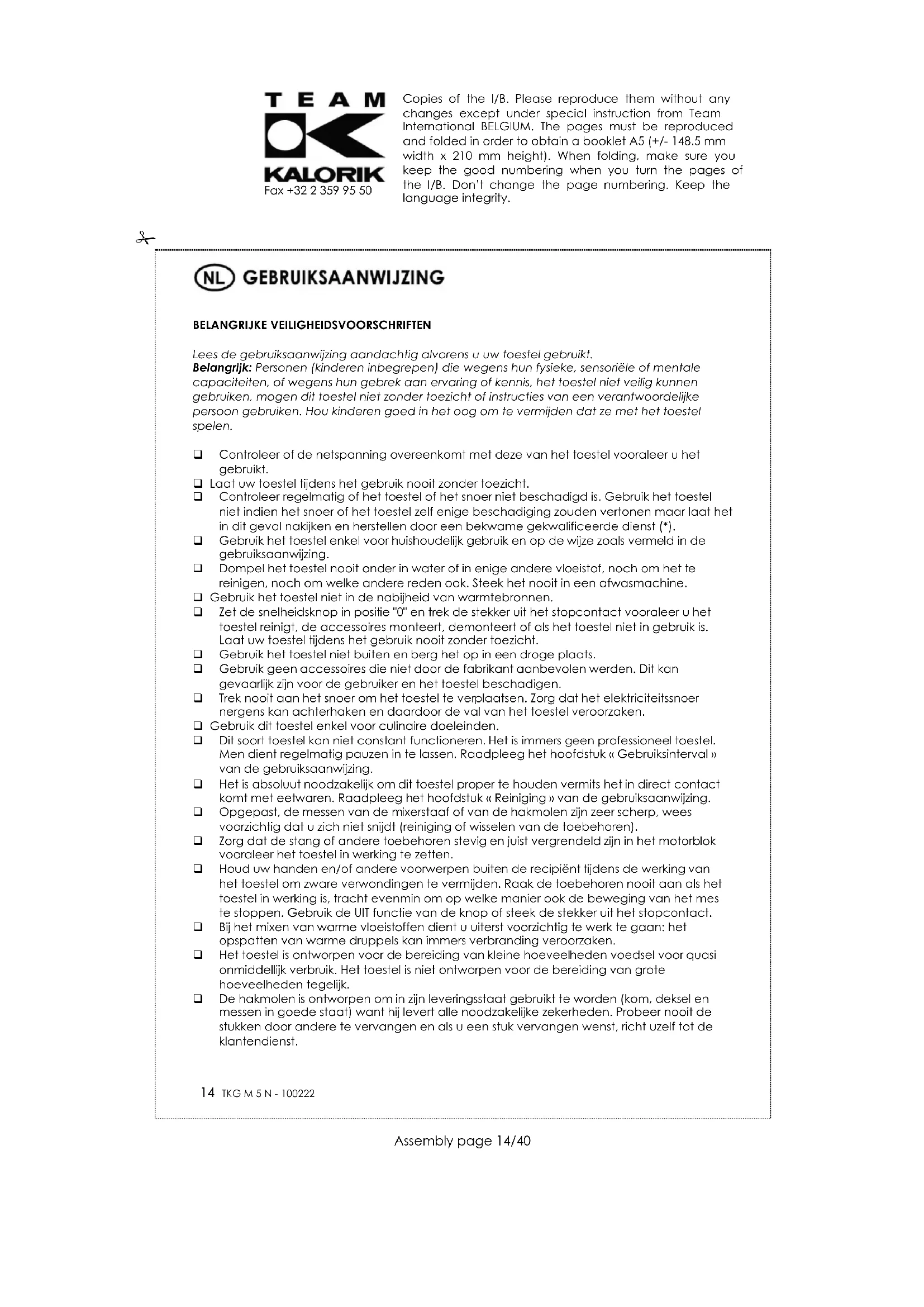 Om ons milieu en onze gezondheid te beschermen, moet afgedankte elektrische en elektronische apparatuur in overeenstemming met welbepaalde regels weggegooid worden. Dit vergt zowel de inzet van de leveranciers als van de gebruikers. Om deze reden mag uw apparaat, zoals op het typeplaatje of op de verpakking aangegeven door het symbool , niet met het gewone huisvuil weggegooid worden. De gebruiker heeft het recht het toestel gratis naar een gemeentelijk centrum van gescheiden inzameling te brengen waar het overeenkomstig de richtlijn hergebruikt, gerecycleerd of voor andere doeleinden gebruikt zal worden. Copies of the I/B. Please reproduce them without any changes except under special instruction from Team International BELGIUM. The pages must be reproduced and folded in order to obtain a booklet A5 (+/- 148.5 mm width x 210 mm height). When folding, make sure you keep the good numbering when you turn the pages of the I/B. Don’t change the page numbering. Keep the language integrity.