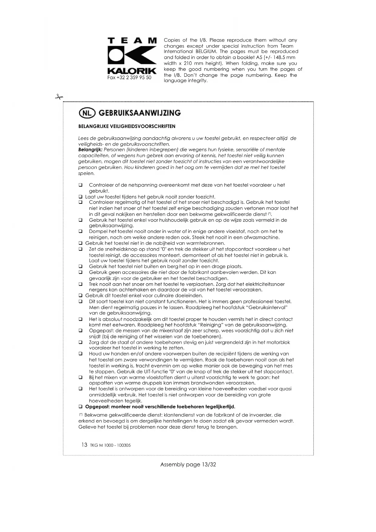 Om ons milieu en onze gezondheid te beschermen, moet afgedankte elektrische en elektronische apparatuur in overeenstemming met welbepaalde regels weggegooid worden. Dit vergt zowel de inzet van de leveranciers als van de gebruikers. Om deze reden mag uw apparaat, zoals op het typeplaatje of op de verpakking aangegeven door het symbool , niet met het gewone huisvuil weggegooid worden. De gebruiker heeft het recht het toestel gratis naar een gemeentelijk centrum van gescheiden inzameling te brengen waar het overeenkomstig de richtlijn hergebruikt, gerecycleerd of voor andere doeleinden gebruikt zal worden. Copies of the I/B. Please reproduce them without any changes except under special instruction from Team International BELGIUM. The pages must be reproduced and folded in order to obtain a booklet A5 (+/- 148.5 mm width x 210 mm height). When folding, make sure you keep the good numbering when you turn the pages of the I/B. Don’t change the page numbering. Keep the language integrity.
