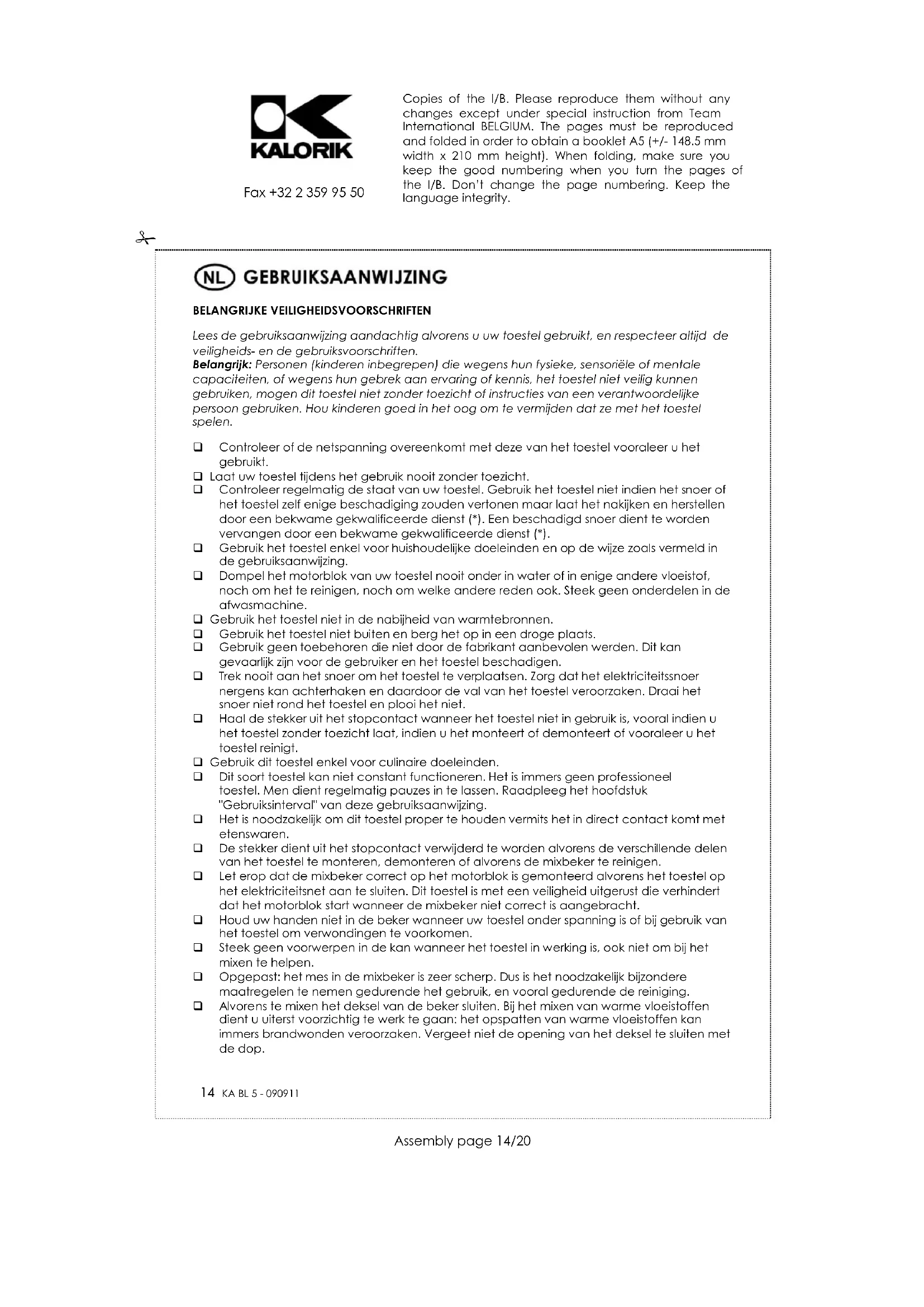 BELANGRIJKE VEILIGHEIDSVOORSCHRIFTEN Lees de gebruiksaanwijzing aandachtig alvorens u uw toestel gebruikt, en respecteer altijd de veiligheids- en de gebruiksvoorschriften. Belangrijk: Personen (kinderen inbegrepen) die wegens hun fysieke, sensoriële of mentale capaciteiten, of wegens hun gebrek aan ervaring of kennis, het toestel niet veilig kunnen gebruiken, mogen dit toestel niet zonder toezicht of instructies van een verantwoordelijke persoon gebruiken. Hou kinderen goed in het oog om te vermijden dat ze met het toestel spelen. Controleer of de netspanning overeenkomt met deze van het toestel vooraleer u het gebruikt. Laat uw toestel tijdens het gebruik nooit zonder toezicht. Controleer regelmatig de staat van uw toestel. Gebruik het toestel niet indien het snoer of het toestel zelf enige beschadiging zouden vertonen maar laat het nakijken en herstellen door een bekwame gekwalificeerde dienst (*). Een beschadigd snoer dient te worden vervangen door een bekwame gekwalificeerde dienst (*). Gebruik het toestel enkel voor huishoudelijke doeleinden en op de wijze zoals vermeld in de gebruiksaanwijzing. Dompel het motorblok van uw toestel nooit onder in water of in enige andere vloeistof, noch om het te reinigen, noch om welke andere reden ook. Steek geen onderdelen in de afwasmachine. Gebruik het toestel niet in de nabijheid van warmtebronnen. Gebruik het toestel niet buiten en berg het op in een droge plaats. Gebruik geen toebehoren die niet door de fabrikant aanbevolen werden. Dit kan gevaarlijk zijn voor de gebruiker en het toestel beschadigen. Trek nooit aan het snoer om het toestel te verplaatsen. Zorg dat het elektriciteitssnoer nergens kan achterhaken en daardoor de val van het toestel veroorzaken. Draai het snoer niet rond het toestel en plooi het niet. Haal de stekker uit het stopcontact wanneer het toestel niet in gebruik is, vooral indien u het toestel zonder toezicht laat, indien u het monteert of demonteert of vooraleer u het toestel reinigt. Gebruik dit toestel enkel voor culinaire doeleinden. Dit soort toestel kan niet constant functioneren. Het is immers geen professioneel toestel. Men dient regelmatig pauzes in te lassen. Raadpleeg het hoofdstuk "Gebruiksinterval" van deze gebruiksaanwijzing. Het is noodzakelijk om dit toestel proper te houden vermits het in direct contact komt met etenswaren. De stekker dient uit het stopcontact verwijderd te worden alvorens de verschillende delen van het toestel te monteren, demonteren of alvorens de mixbeker te reinigen. Let erop dat de mixbeker correct op het motorblok is gemonteerd alvorens het toestel op het elektriciteitsnet aan te sluiten. Dit toestel is met een veiligheid uitgerust die verhindert dat het motorblok start wanneer de mixbeker niet correct is aangebracht. Houd uw handen niet in de beker wanneer uw toestel onder spanning is of bij gebruik van het toestel om verwondingen te voorkomen. Steek geen voorwerpen in de kan wanneer het toestel in werking is, ook niet om bij het mixen te helpen. Opgepast: het mes in de mixbeker is zeer scherp. Dus is het noodzakelijk bijzondere maatregelen te nemen gedurende het gebruik, en vooral gedurende de reiniging. Alvorens te mixen het deksel van de beker sluiten. Bij het mixen van warme vloeistoffen dient u uiterst voorzichtig te werk te gaan: het opspatten van warme vloeistoffen kan immers brandwonden veroorzaken. Vergeet niet de opening van het deksel te sluiten met de dop. Copies of the I/B. Please reproduce them without any changes except under special instruction from Team International BELGIUM. The pages must be reproduced and folded in order to obtain a booklet A5 (+/- 148.5 mm width x 210 mm height). When folding, make sure you keep the good numbering when you turn the pages of the I/B. Don’t change the page numbering. Keep the language integrity. 15 KA BL 5 - 090911