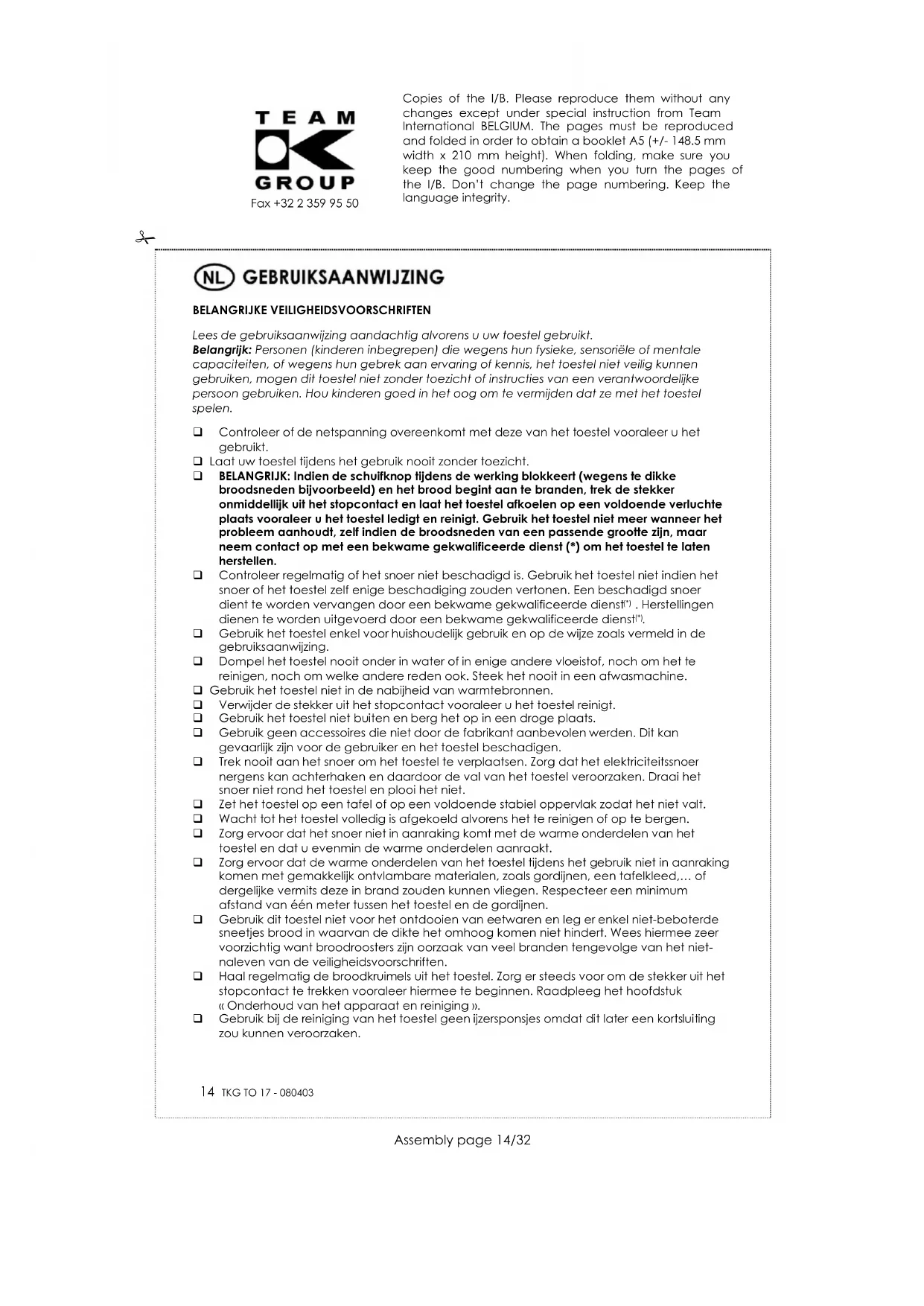 Gebruik het toestel enkel voor huishoudelijk gebruik en op de wijze zoals vermeld in de gebruiksaanwijzing. Dompel het toestel nooit onder in water of in enige andere vloeistof, noch om het te reinigen, noch om welke andere reden ook. Steek het nooit in een afwasmachine. Gebruik het toestel niet in de nabijheid van warmtebronnen. Verwijder de stekker uit het stopcontact vooraleer u het toestel reinigt. Gebruik het toestel niet buiten en berg het op in een droge plaats. Gebruik geen accessoires die niet door de fabrikant aanbevolen werden. Dit kan gevaarlijk zijn voor de gebruiker en het toestel beschadigen. Trek nooit aan het snoer om het toestel te verplaatsen. Zorg dat het elektriciteitssnoer nergens kan achterhaken en daardoor de val van het toestel veroorzaken. Draai het snoer niet rond het toestel en plooi het niet. Zet het toestel op een tafel of op een voldoende stabiel oppervlak zodat het niet valt. Wacht tot het toestel volledig is afgekoeld alvorens het te reinigen of op te bergen. Zorg ervoor dat het snoer niet in aanraking komt met de warme onderdelen van het toestel en dat u evenmin de warme onderdelen aanraakt. Zorg ervoor dat de warme onderdelen van het toestel tijdens het gebruik niet in aanraking komen met gemakkelijk ontvlambare materialen, zoals gordijnen, een tafelkleed,… of dergelijke vermits deze in brand zouden kunnen vliegen. Respecteer een minimum afstand van één meter tussen het toestel en de gordijnen. Gebruik dit toestel niet voor het ontdooien van eetwaren en leg er enkel niet-beboterde sneetjes brood in waarvan de dikte het omhoog komen niet hindert. Wees hiermee zeer voorzichtig want broodroosters zijn oorzaak van veel branden tengevolge van het niet- naleven van de veiligheidsvoorschriften. Haal regelmatig de broodkruimels uit het toestel. Zorg er steeds voor om de stekker uit het stopcontact te trekken vooraleer hiermee te beginnen. Raadpleeg het hoofdstuk « Onderhoud van het apparaat en reiniging ». Gebruik bij de reiniging van het toestel geen ijzersponsjes omdat dit later een kortsluiting zou kunnen veroorzaken. Copies of the I/B. Please reproduce them without any changes except under special instruction from Team International BELGIUM. The pages must be reproduced and folded in order to obtain a booklet A5 (+/- 148.5 mm width x 210 mm height). When folding, make sure you keep the good numbering when you turn the pages of the I/B. Don’t change the page numbering. Keep the language integrity.