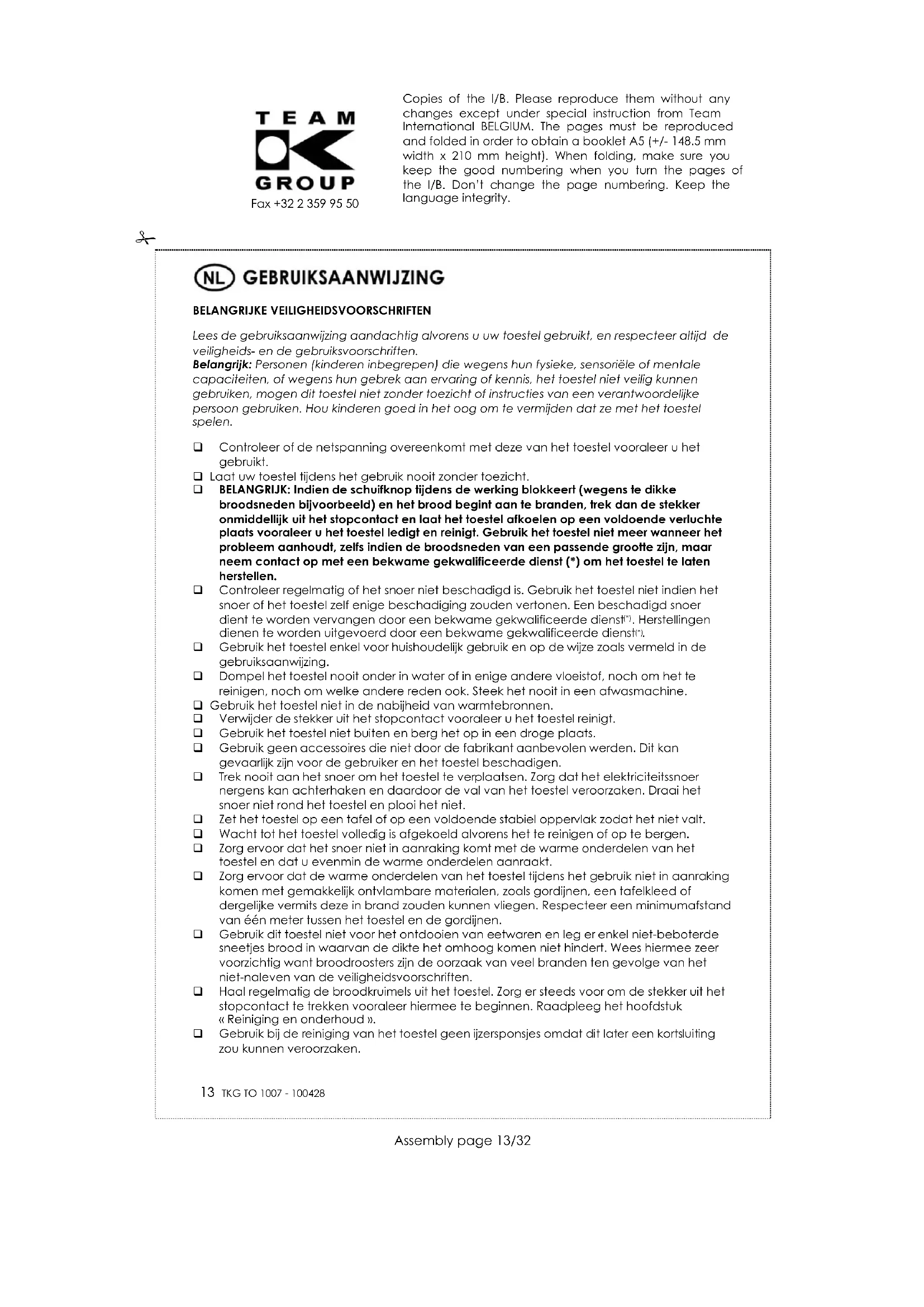 Gebruik het toestel enkel voor huishoudelijk gebruik en op de wijze zoals vermeld in de gebruiksaanwijzing. Dompel het toestel nooit onder in water of in enige andere vloeistof, noch om het te reinigen, noch om welke andere reden ook. Steek het nooit in een afwasmachine. Gebruik het toestel niet in de nabijheid van warmtebronnen. Verwijder de stekker uit het stopcontact vooraleer u het toestel reinigt. Gebruik het toestel niet buiten en berg het op in een droge plaats. Gebruik geen accessoires die niet door de fabrikant aanbevolen werden. Dit kan gevaarlijk zijn voor de gebruiker en het toestel beschadigen. Trek nooit aan het snoer om het toestel te verplaatsen. Zorg dat het elektriciteitssnoer nergens kan achterhaken en daardoor de val van het toestel veroorzaken. Draai het snoer niet rond het toestel en plooi het niet. Zet het toestel op een tafel of op een voldoende stabiel oppervlak zodat het niet valt. Wacht tot het toestel volledig is afgekoeld alvorens het te reinigen of op te bergen. Zorg ervoor dat het snoer niet in aanraking komt met de warme onderdelen van het toestel en dat u evenmin de warme onderdelen aanraakt. Zorg ervoor dat de warme onderdelen van het toestel tijdens het gebruik niet in aanraking komen met gemakkelijk ontvlambare materialen, zoals gordijnen, een tafelkleed of dergelijke vermits deze in brand zouden kunnen vliegen. Respecteer een minimumafstand van één meter tussen het toestel en de gordijnen. Gebruik dit toestel niet voor het ontdooien van eetwaren en leg er enkel niet-beboterde sneetjes brood in waarvan de dikte het omhoog komen niet hindert. Wees hiermee zeer voorzichtig want broodroosters zijn de oorzaak van veel branden ten gevolge van het niet-naleven van de veiligheidsvoorschriften. Haal regelmatig de broodkruimels uit het toestel. Zorg er steeds voor om de stekker uit het stopcontact te trekken vooraleer hiermee te beginnen. Raadpleeg het hoofdstuk « Reiniging en onderhoud ». Gebruik bij de reiniging van het toestel geen ijzersponsjes omdat dit later een kortsluiting zou kunnen veroorzaken. Copies of the I/B. Please reproduce them without any changes except under special instruction from Team International BELGIUM. The pages must be reproduced and folded in order to obtain a booklet A5 (+/- 148.5 mm width x 210 mm height). When folding, make sure you keep the good numbering when you turn the pages of the I/B. Don’t change the page numbering. Keep the language integrity.