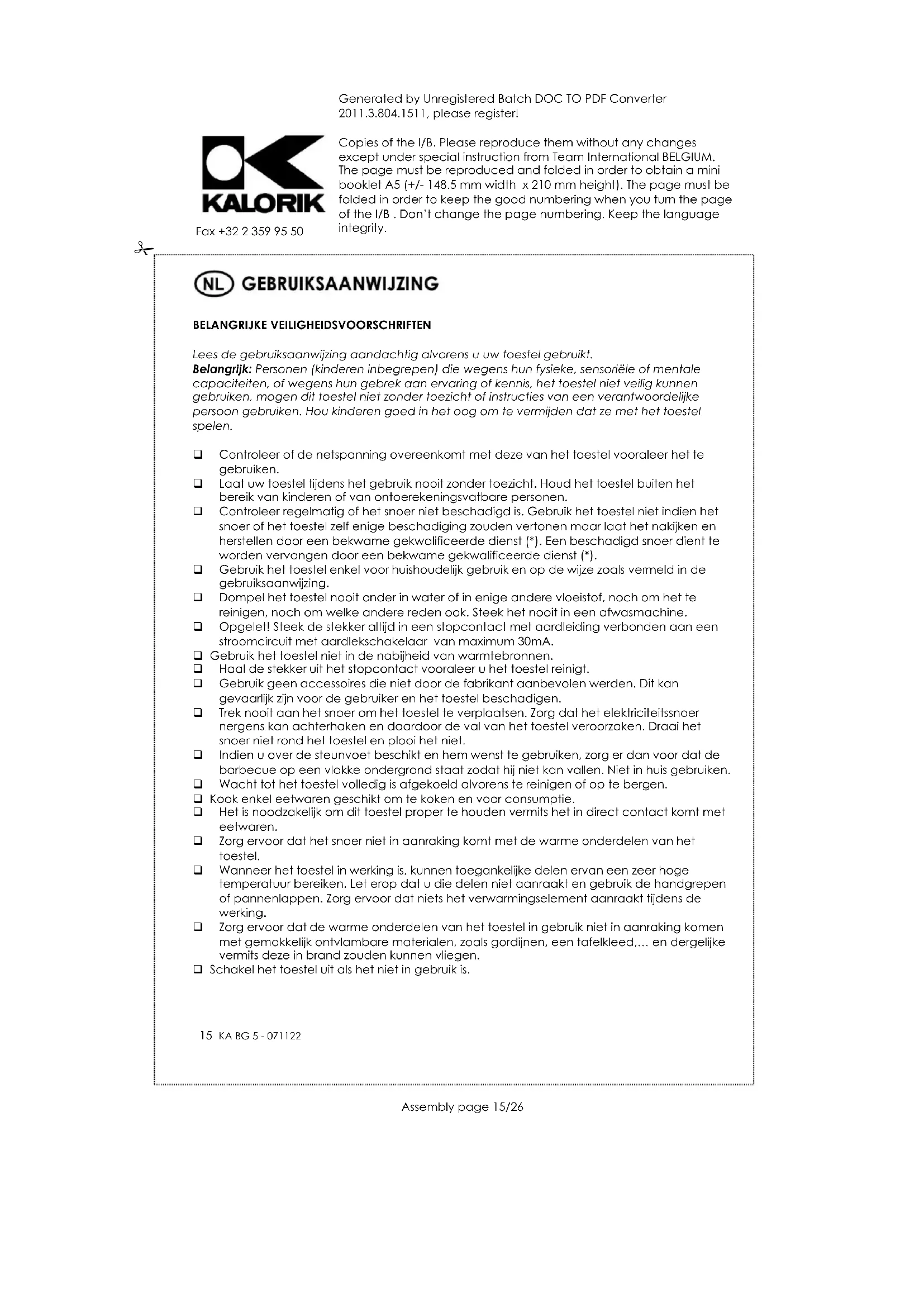 Om ons milieu en onze gezondheid te beschermen, moet afgedankte elektrische en elektronische apparatuur in overeenstemming met welbepaalde regels weggegooid worden. Dit vergt zowel de inzet van de leveranciers als van de gebruikers. Om deze reden mag uw apparaat, zoals op het typeplaatje of op de verpakking aangegeven door het symbool , niet met het gewone huisvuil weggegooid worden. De gebruiker heeft het recht het toestel gratis naar een gemeentelijk centrum van gescheiden inzameling te brengen waar het overeenkomstig de richtlijn hergebruikt, gerecycleerd of voor andere doeleinden gebruikt zal worden.Generated by Unregistered Batch DOC TO PDF Converter 2011.3.804.1511, please register! Copies of the I/B. Please reproduce them without any changes except under special instruction from Team International BELGIUM. The page must be reproduced and folded in order to obtain a mini booklet A5 (+/- 148.5 mm width x 210 mm height). The page must be folded in order to keep the good numbering when you turn the page of the I/B . Don’t change the page numbering. Keep the language integrity.