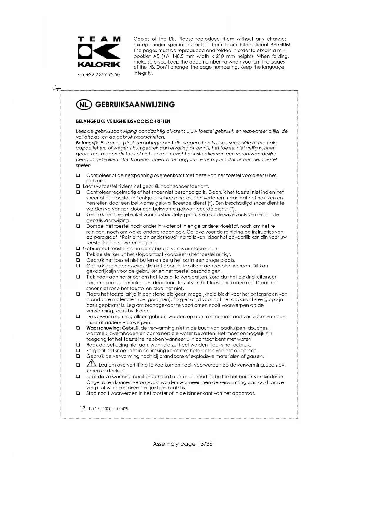 BELANGRIJKE VEILIGHEIDSVOORSCHRIFTEN Lees de gebruiksaanwijzing aandachtig alvorens u uw toestel gebruikt, en respecteer altijd de veiligheids- en de gebruiksvoorschriften. Belangrijk: Personen (kinderen inbegrepen) die wegens hun fysieke, sensoriële of mentale capaciteiten, of wegens hun gebrek aan ervaring of kennis, het toestel niet veilig kunnen gebruiken, mogen dit toestel niet zonder toezicht of instructies van een verantwoordelijke persoon gebruiken. Hou kinderen goed in het oog om te vermijden dat ze met het toestel spelen. Controleer of de netspanning overeenkomt met deze van het toestel vooraleer u het gebruikt. Laat uw toestel tijdens het gebruik nooit zonder toezicht. Controleer regelmatig of het snoer niet beschadigd is. Gebruik het toestel niet indien het snoer of het toestel zelf enige beschadiging zouden vertonen maar laat het nakijken en herstellen door een bekwame gekwalificeerde dienst (*). Een beschadigd snoer dient te worden vervangen door een bekwame gekwalificeerde dienst (*). Gebruik het toestel enkel voor huishoudelijk gebruik en op de wijze zoals vermeld in de gebruiksaanwijzing. Dompel het toestel nooit onder in water of in enige andere vloeistof, noch om het te reinigen, noch om welke andere reden ook. Gelieve voor de reiniging de instructies van de paragraaf “Reiniging en onderhoud” na te leven, daar het gevaarlijk kan zijn voor uw toestel indien er water in sijpelt. Gebruik het toestel niet in de nabijheid van warmtebronnen. Trek de stekker uit het stopcontact vooraleer u het toestel reinigt. Gebruik het toestel niet buiten en berg het op in een droge plaats. Gebruik geen accessoires die niet door de fabrikant aanbevolen werden. Dit kan gevaarlijk zijn voor de gebruiker en het toestel beschadigen. Trek nooit aan het snoer om het toestel te verplaatsen. Zorg dat het elektriciteitssnoer nergens kan achterhaken en daardoor de val van het toestel veroorzaken. Draai het snoer niet rond het toestel en plooi het niet. Plaats het toestel altijd in een stand die geen mogelijkheid biedt voor het ontbranden van brandbare materialen (bv. gordijnen). Zorg er altijd voor dat het apparaat stevig op zijn basis geplaatst is. Leg om brandgevaar te voorkomen nooit voorwerpen op de verwarming, zoals bv. kleren. De verwarming mag alleen gebruikt worden op een minimumafstand van 50cm van een muur of andere voorwerpen. Waarschuwing: Gebruik de verwarming niet in de buurt van badkuipen, douches, wastafels, zwembaden en containers die water bevatten. Het moet onmogelijk zijn toegang tot het toestel te hebben wanneer u in contact bent met water. Raak de behuizing niet aan, want die zal heet worden tijdens het gebruik. Zorg dat het snoer niet in aanraking komt met hete delen van het apparaat. Gebruik de verwarming nooit bij brandbare of explosieve materialen of gassen. Leg om oververhitting te voorkomen nooit voorwerpen op de verwarming, zoals bv. kleren of doeken. Laat de verwarming nooit onbeheerd achter en houd ze buiten het bereik van kinderen. Ongelukken kunnen veroorzaakt worden wanneer men de verwarming aanraakt, omver werpt of wanneer deze niet juist geplaatst is. Stop nooit voorwerpen in het rooster of in de binnenkant van het apparaat.Copies of the I/B. Please reproduce them without any changes except under special instruction from Team International BELGIUM. The pages must be reproduced and folded in order to obtain a mini booklet A5 (+/- 148.5 mm width x 210 mm height). When folding, make sure you keep the good numbering when you turn the pages of the I/B. Don’t change the page numbering. Keep the language integrity.