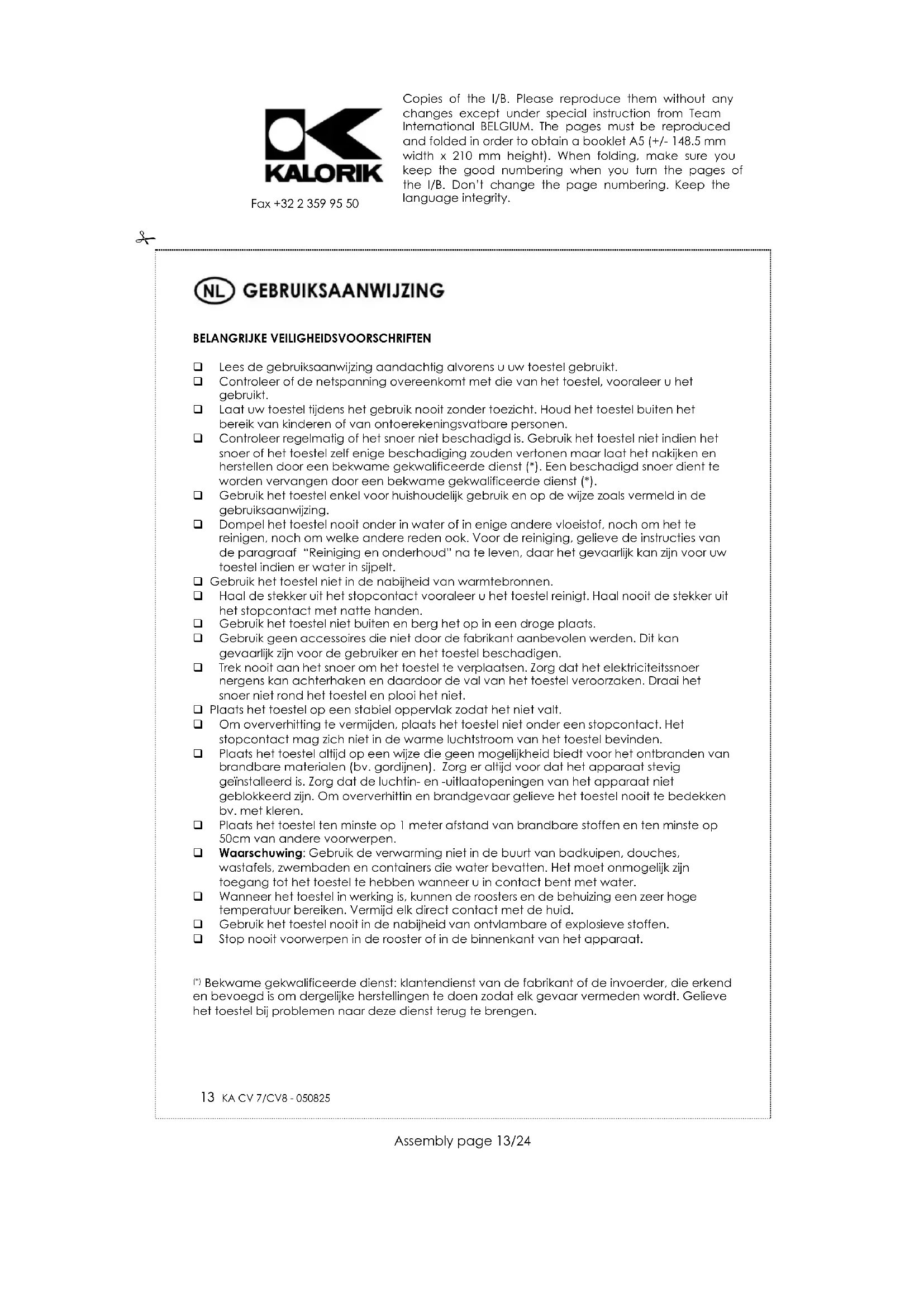 Om ons milieu en onze gezondheid te beschermen, moet afgedankte elektrische en elektronische apparatuur in overeenstemming met welbepaalde regels weggegooid worden. Dit vergt zowel de inzet van de leveranciers als van de gebruikers. Om deze reden mag uw apparaat, zoals op het typeplaatje aangegeven door het symbool , niet met het gewone huisvuil weggegooid worden, maar moet het ofwel naar de verkoper teruggestuurd worden, ofwel naar een centrum van gescheiden inzameling waar het hergebruikt, gerecycleerd op voor andere doeleinden gebruikt zal worden. Copies of the I/B. Please reproduce them without any changes except under special instruction from Team International BELGIUM. The pages must be reproduced and folded in order to obtain a booklet A5 (+/- 148.5 mm width x 210 mm height). When folding, make sure you keep the good numbering when you turn the pages of the I/B. Don’t change the page numbering. Keep the language integrity. 16 KA CV 7/CV8 - 050825