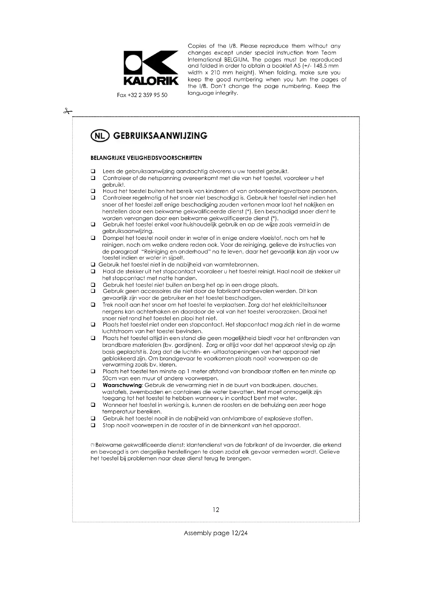 Haal altijd de stekker uit het stopcontact en laat het apparaat geheel afkoelen vooraleer u het schoonmaakt. Om elektrische schokken te voorkomen, maak het apparaat nooit schoon met water en dompel het nooit onder in water of enige andere vloeistof. Reinig de behuizing met een vochtige doek. Wanneer nodig mogen stofdeeltjes in de luchtuitlaatopeningen met een stofzuiger verwijderd worden. Een regelmatig onderhoud is noodzakelijk voor de goede werking van het toestel. Copies of the I/B. Please reproduce them without any changes except under special instruction from Team International BELGIUM. The pages must be reproduced and folded in order to obtain a booklet A5 (+/- 148.5 mm width x 210 mm height). When folding, make sure you keep the good numbering when you turn the pages of the I/B. Don’t change the page numbering. Keep the language integrity.