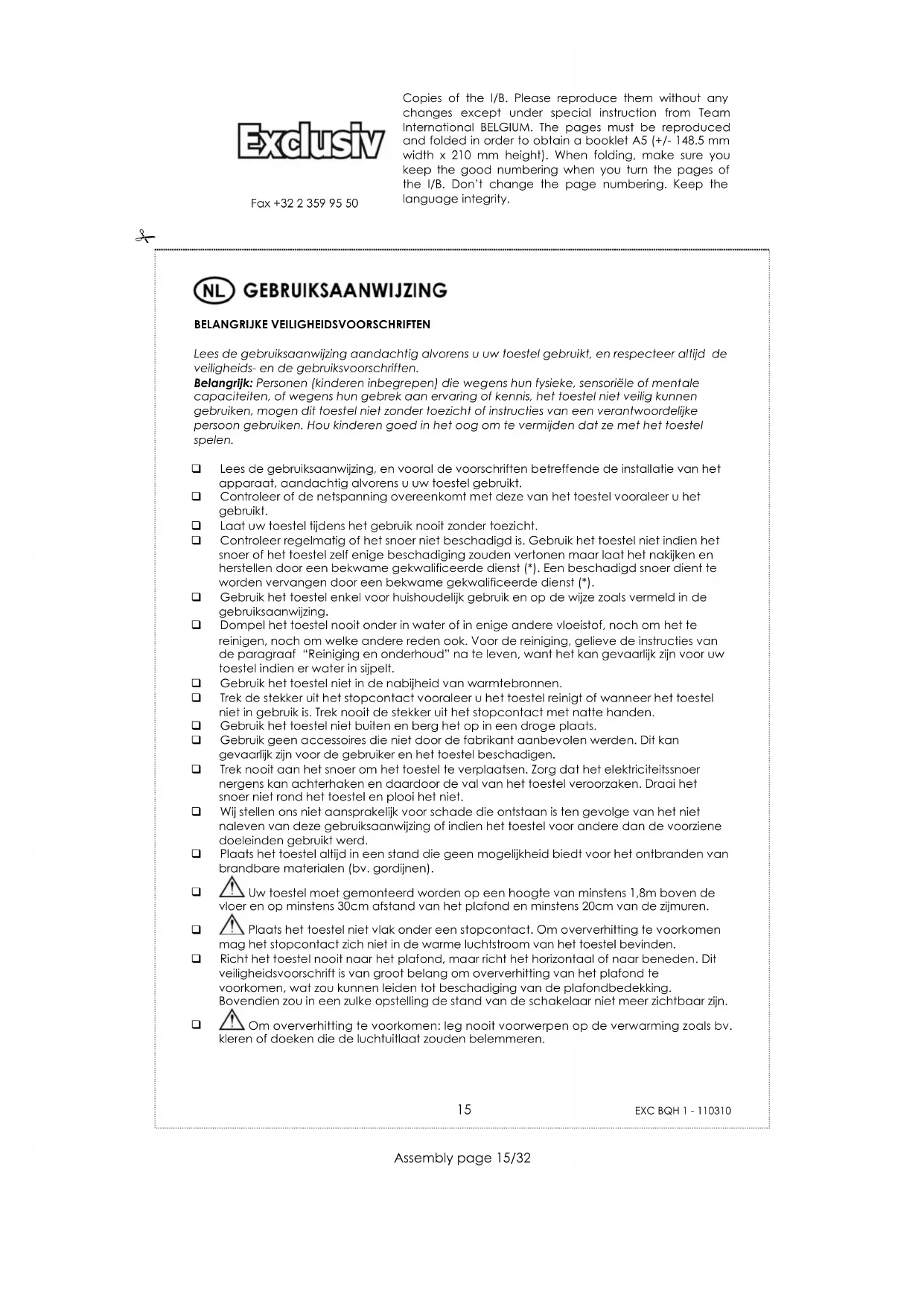 Assembly page 15/32 Copies of the I/B. Please reproduce them without any changes except under special instruction from Team International BELGIUM. The pages must be reproduced and folded in order to obtain a booklet A5 (+/- 148.5 mm width x 210 mm height). When folding, make sure you keep the good numbering when you turn the pages of the I/B. Don’t change the page numbering. Keep the language integrity. Fax +32 2 359 95 50 Waarschuwing: Gebruik de verwarming niet in de buurt van badkuipen, douches, wastafels, zwembaden en containers die water bevatten. Het moet onmogelijk zijn toegang tot het toestel te hebben wanneer u in contact bent met water. Wanneer het toestel in werking is, kunnen de roosters ervan een zeer hoge temperatuur bereiken. Vermijd contact met de huid. Zorg ervoor dat het snoer niet in aanraking komt met de warme delen van het toestel. Gebruik het toestel nooit in de nabijheid van ontvlambare of explosieve stoffen. Stop nooit voorwerpen in het rooster of in de binnenkant van het apparaat. Gebruik geen adapter om de stekker in het stopcontact te steken. Gebruik geen programmakiezer, tijdschakelaar of ander gelijkaardig apparaat dat uw toestel automatisch aanschakelt, want er zou brand kunnen ontstaan als het toestel bedekt is of fout geplaatst is. Opgelet: de radiator moet ten minste 1m80 boven de vloer worden geïnstalleerd. Tijdens de montage is het belangrijk om er heel goed op te letten dat u de verwarmingselementen niet aanraakt met uw handen, want dit zou vlekken kunnen achterlaten die de warmtestraling zouden verminderen. Gebruik de radiator nooit op plaatsen waar de atmosfeer te veel chloor, sulfaatdioxide of ontvlambaar gas bevat. Deze elementen kunnen verdonkering of verkleuring van de verwarmingselementen veroorzaken en de verwarmingselementen zullen uiteindelijk in kwaliteit verminderen en mogelijk worden vervormd en gaan buigen tijdens het gebruik. (*) Bekwame gekwalificeerde dienst: klantendienst van de fabrikant of de invoerder, die erkend en bevoegd is om dergelijke herstellingen te doen zodat elk gevaar vermeden wordt. Gelieve het toestel bij problemen naar deze dienst terug te brengen. PLAATS VOOR DE INSTALLATIE VAN HET TOESTEL Deze radiator is speciaal ontworpen zodat hij gebruikt kan worden in eender welke kamer van uw huis, ook die waar er een risico bestaat dat er water op het toestel wordt gespat van bovenaf (keuken, badkamer, enz.). Niettemin moeten de elektrische installatie in de kamer, de installatie van het apparaat en de manier waarop het apparaat wordt gebruikt allemaal in overeenstemming zijn met de geldende veiligheidsvoorschriften in uw land. De veiligheidsvoorschriften definiëren 3 volumes in een badkamer (zie diagram op bladzijde 2). Dit apparaat mag enkel worden geïnstalleerd in zone 3 van de kamer, zodat de keuzeschakelaar niet kan worden aangeraakt door iemand die het bad of de douche gebruikt. Gelieve voor andere kamers in het huis deze regel toe te passen: Het apparaat mag alleen worden gebruikt op een minimumafstand van 60cm van andere voorwerpen. Richt de luchtstroom op die manier dat hij de verwarming van de kamer verbetert. Vermijd hoeken, kleine ruimtes, vloeren en plafonds. Opgelet: de radiator moet ten minste 1m80 boven de vloer worden geïnstalleerd. MUURBEVESTIGING (ZIE AFBEELDINGEN OP BLZ. 3) Zorg ervoor dat alle verpakking verwijderd is vooraleer het toestel wordt gebruikt. Dit apparaat is voorzien om aan een muur te worden bevestigd. Ga voor muurbevestiging als volgt te werk: