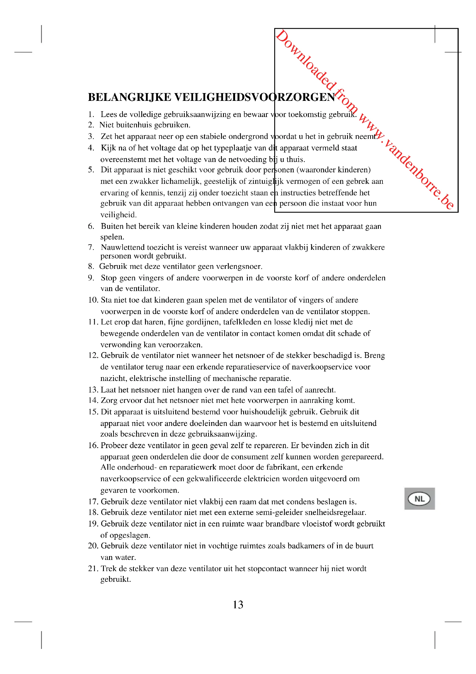 Trek altijd de stekker uit het stopcontact voordat u het apparaat gaat reinigen. Om de ventilator te demonteren volgt u de instructies voor de assemblage in omgekeerde richting. Reinig alle verwijderbare delen in een warm sopje. 18Downloaded from www.vandenborre.be Veeg de behuizing van de ventilator schoon met een vochtige doek. Dompel de motorbehuizing niet onder in water of andere vloeistof. Gebruik geen schuurmiddelen, chemische of alcoholhoudende producten, benzine of dergelijke om dit apparaat te reinigen, omdat zij het plastic kunnen beschadigen. Berg uw apparaat weg in een veilige en droge plaats wanneer u het niet gebruikt.