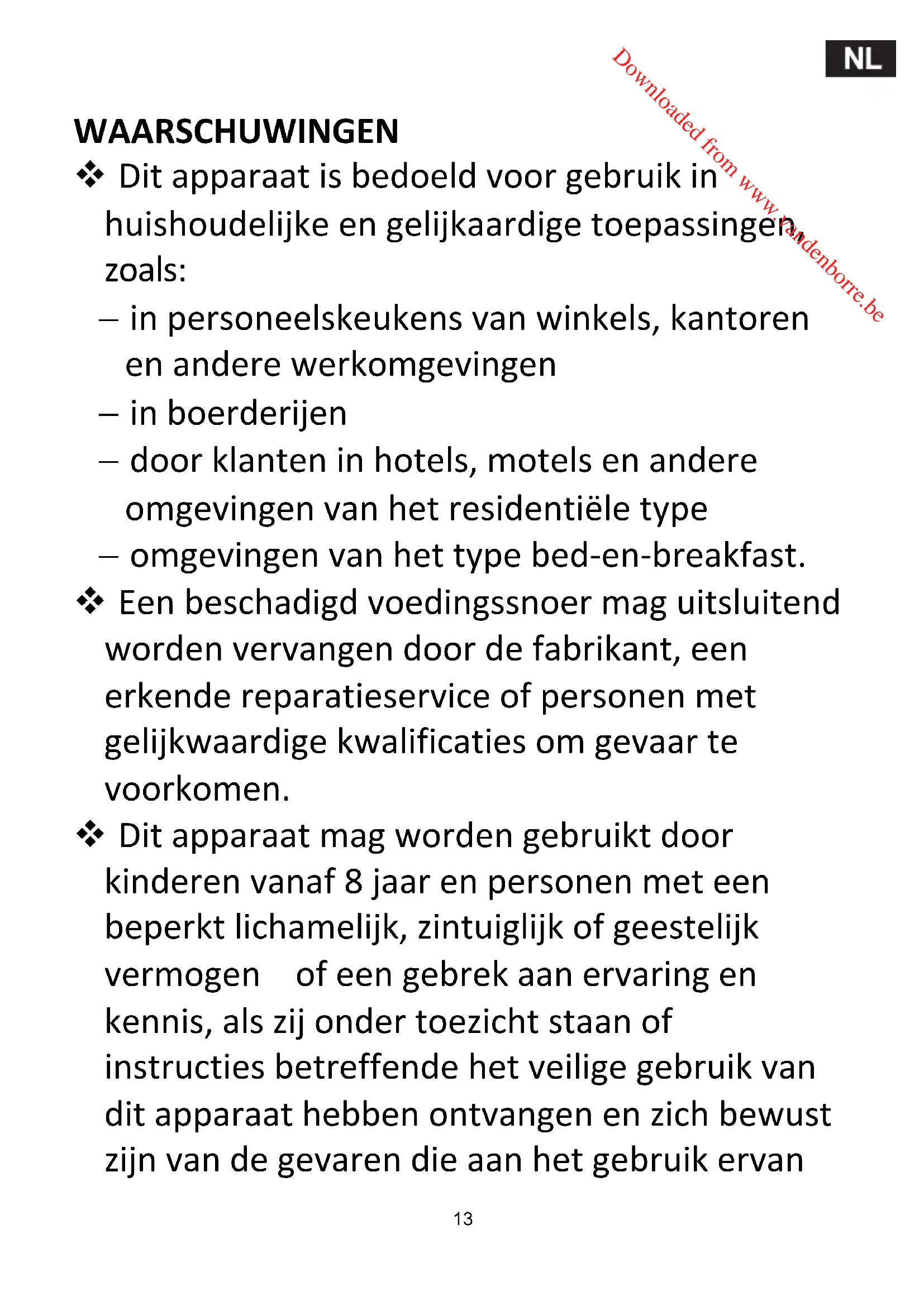 Downloaded from www.vandenborre.beWAARSCHUWINGEN Dit apparaat is bedoeld voor gebruik in huishoudelijke en gelijkaardige toepassingen, zoals: in personeelskeukens van winkels, kantoren en andere werkomgevingen in boerderijen door klanten in hotels, motels en andere omgevingen van het residentiële type omgevingen van het type bed-en-breakfast. Een beschadigd voedingssnoer mag uitsluitend worden vervangen door de fabrikant, een erkende reparatieservice of personen met gelijkwaardige kwalificaties om gevaar te voorkomen. Dit apparaat mag worden gebruikt door kinderen vanaf 8 jaar en personen met een beperkt lichamelijk, zintuiglijk of geestelijk vermogen of een gebrek aan ervaring en kennis, als zij onder toezicht staan of instructies betreffende het veilige gebruik van dit apparaat hebben ontvangen en zich bewust zijn van de gevaren die aan het gebruik ervan